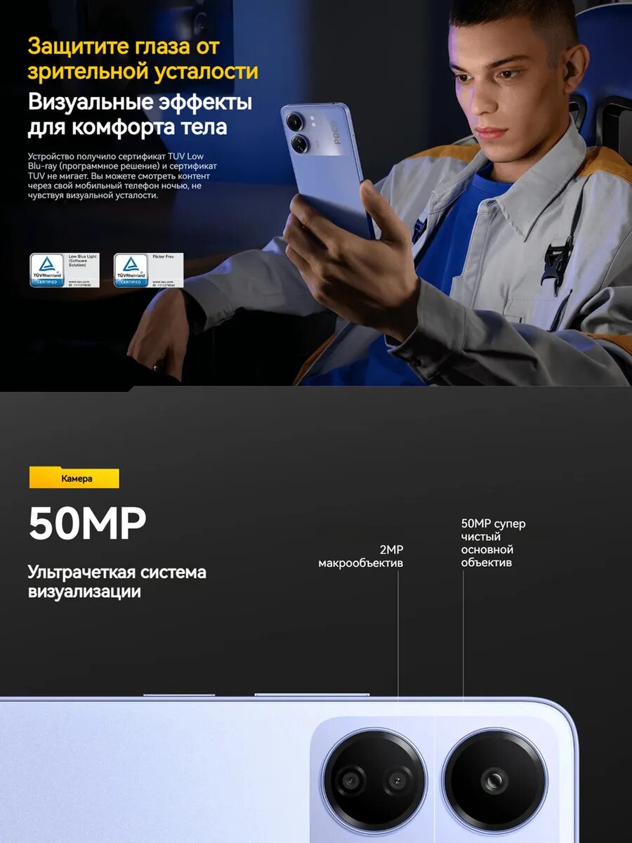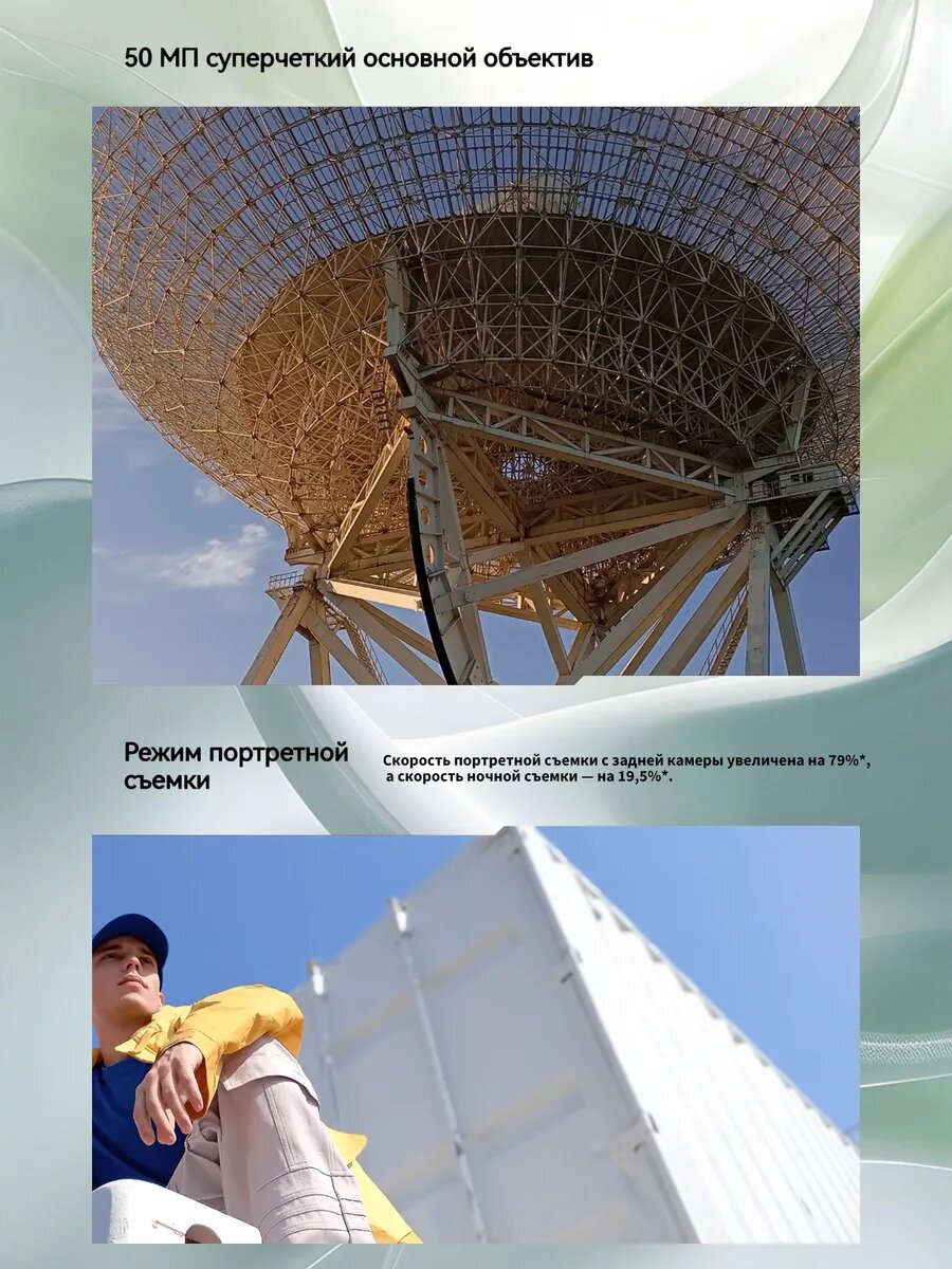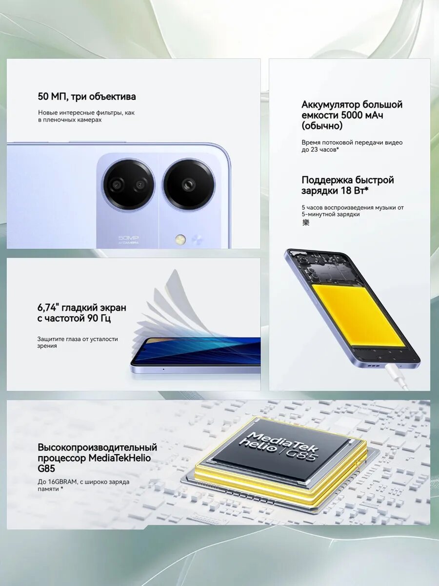 Основная камера 50 Мп снимает детализированные фото даже при слабом освещении. Режим Night Mode снижает шумы на 40% по сравнению с Xiaomi Redmi 9C. Для портретов используется AI-размытие фона с возможностью настройки уровня боке.
