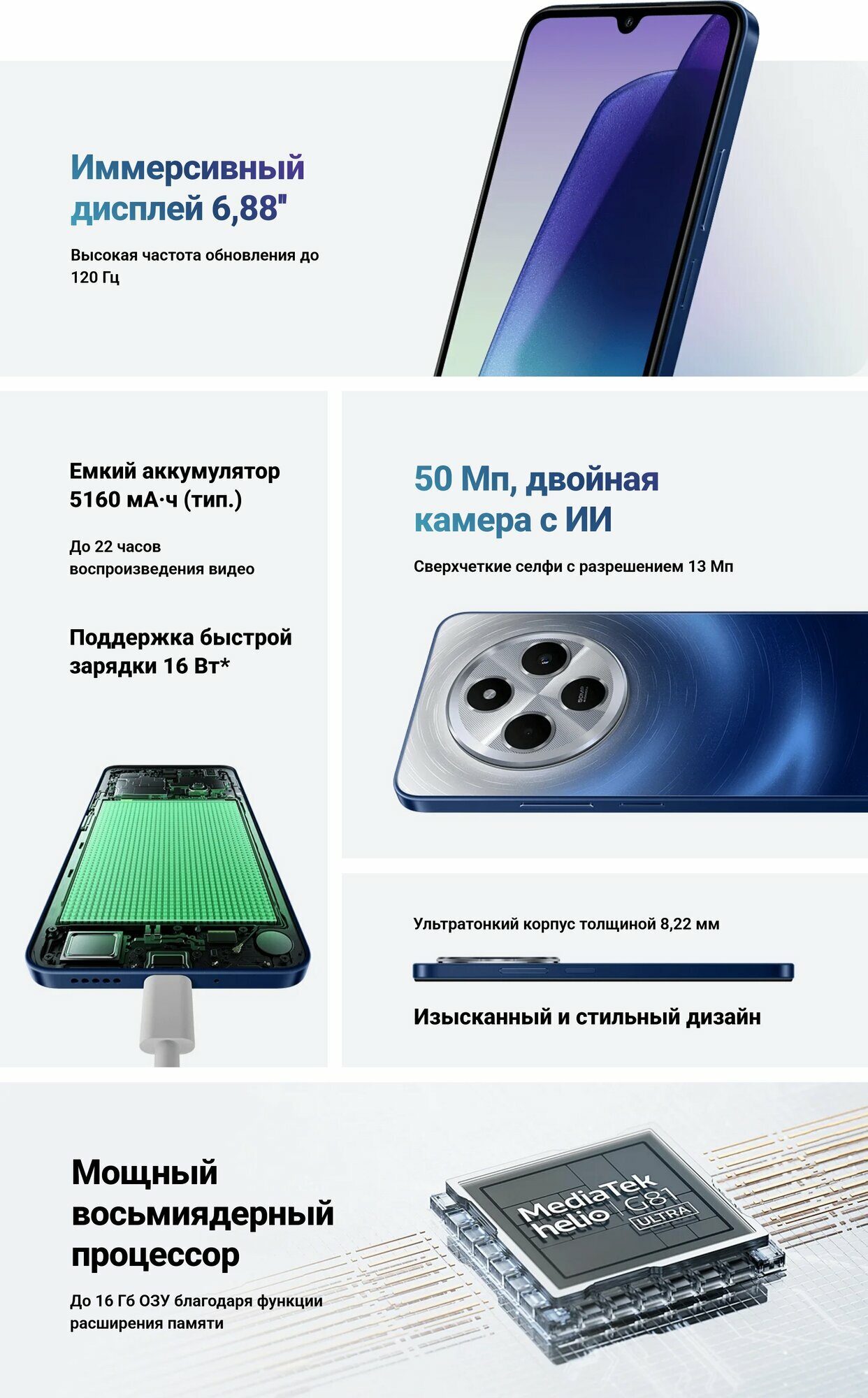 В сравнении с Redmi 13C новая модель получила процессор на 17% производительнее по тестам AnTuTu v10. Обновление до Android 15 гарантировано производителем в 3 квартале 2024 года.