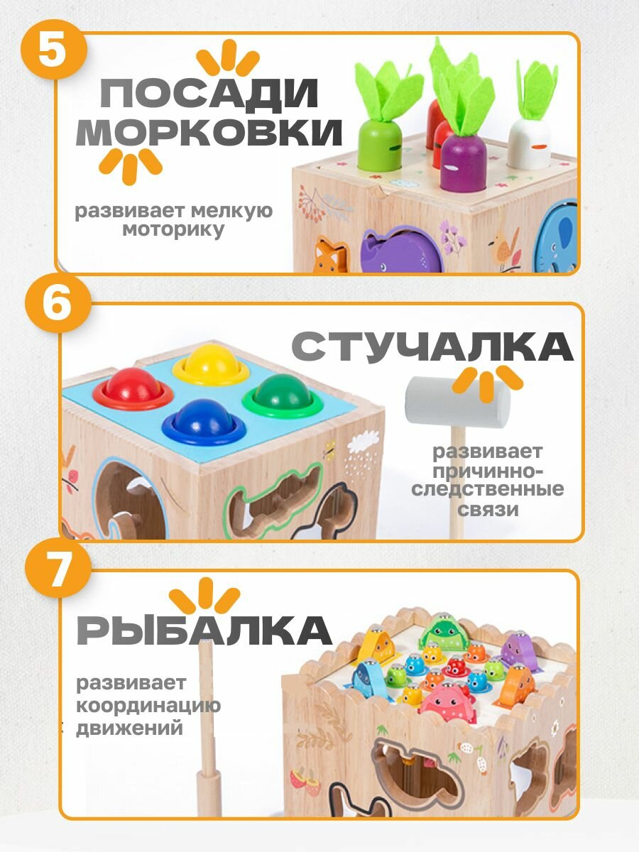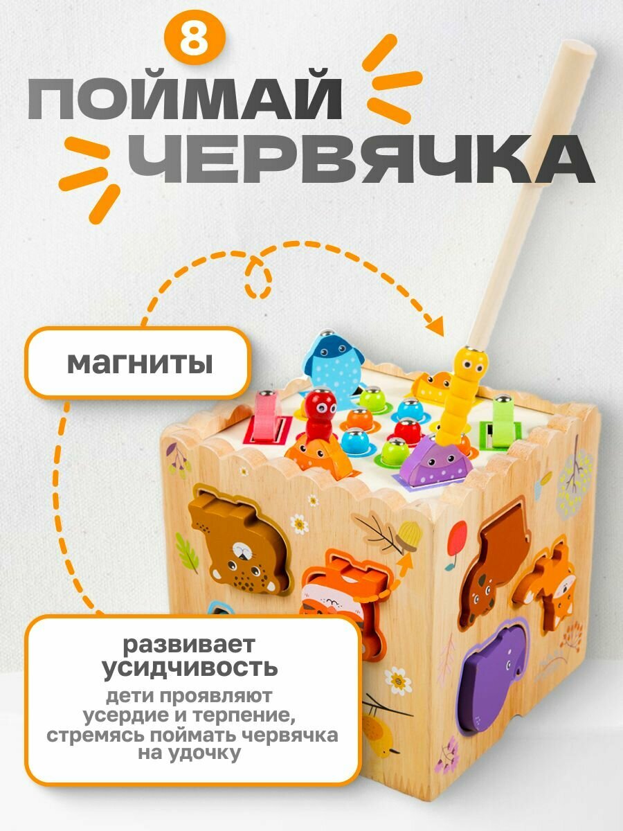 Сортер 8 в 1 создан для гармоничного развития детей от 18 месяцев, соответствуя стандартам Монтессори-педагогики. Комбинированная конструкция из бука с пластиковыми деталями (13x13x12.5 см) проходит тройной контроль качества: