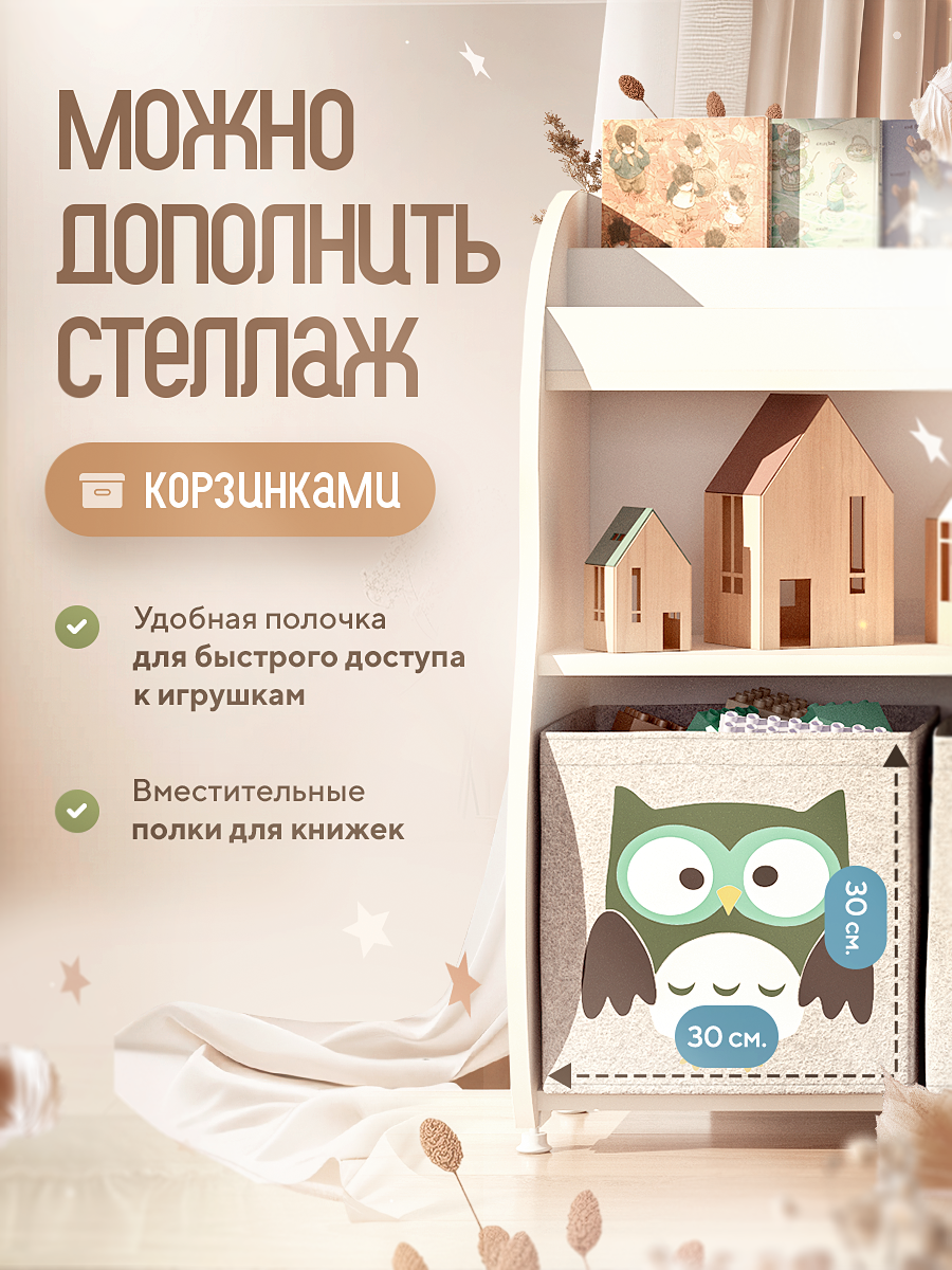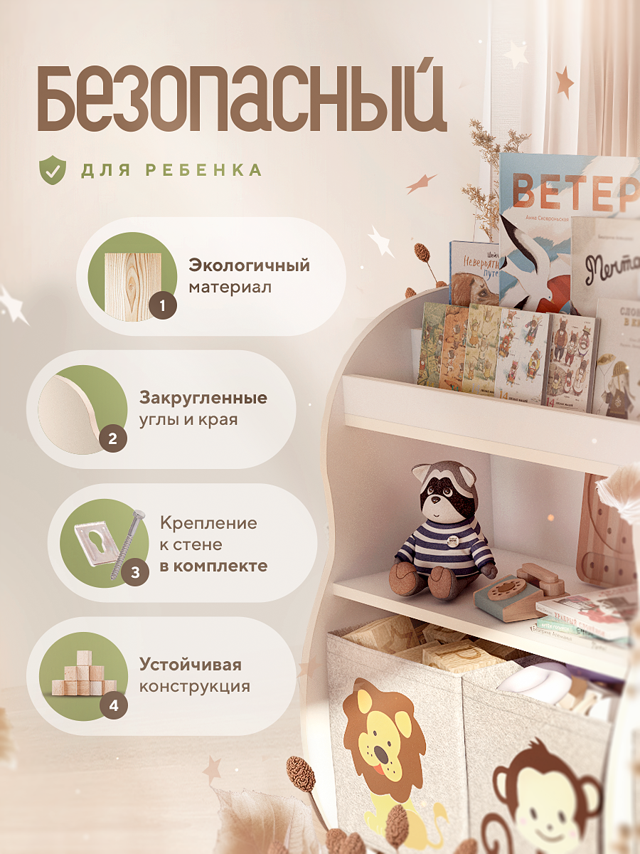 Стеллаж решает 3 ключевые задачи: обеспечивает порядок в детской, развивает самостоятельность ребенка, создает безопасную среду для игр. 92% покупателей отмечают улучшение организации игрового пространства в течение месяца использования.