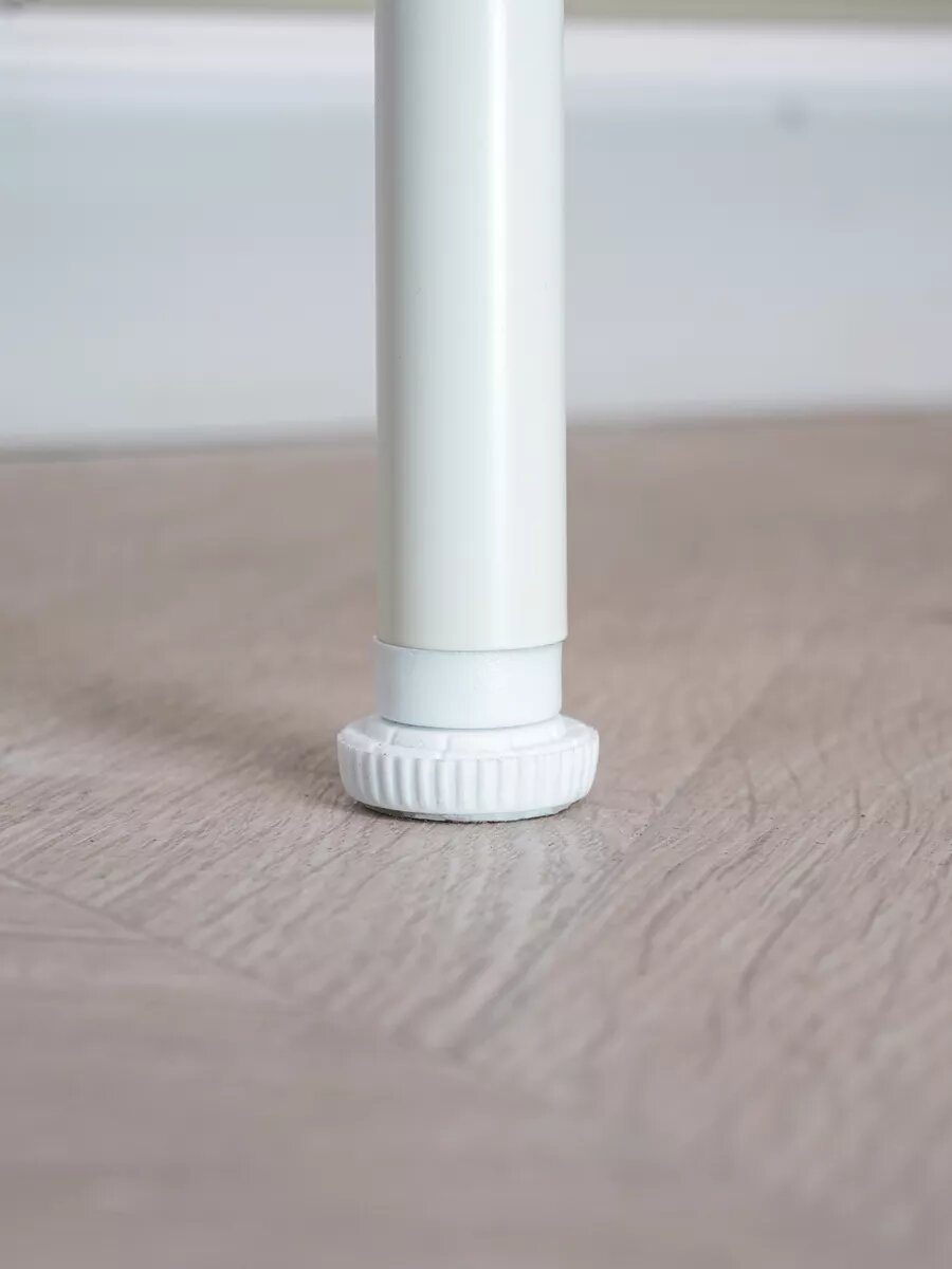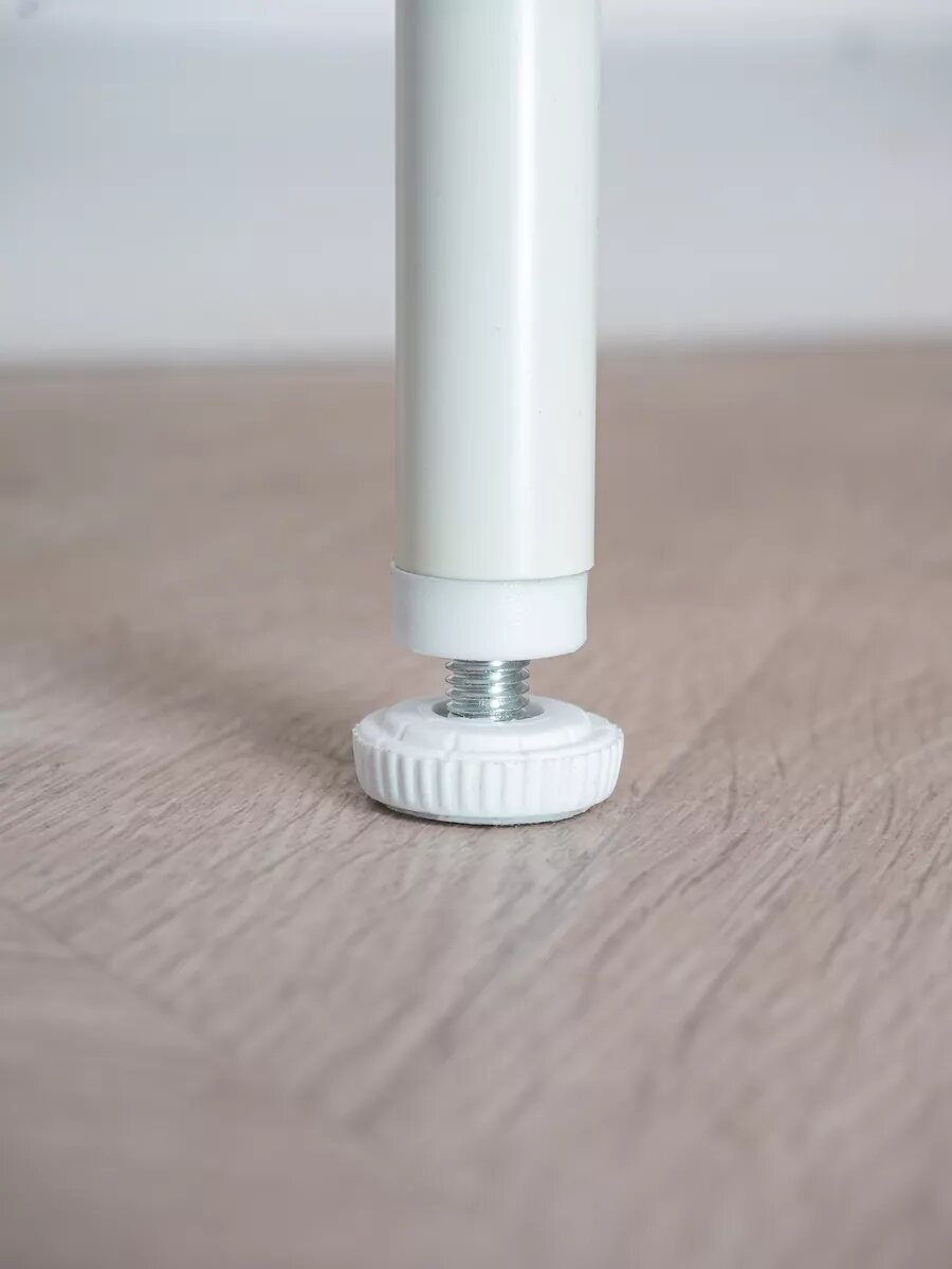 По ГОСТ 25779-2017 для детских товаров все углы каркаса закруглены, а края полок имеют ПВХ-кромку. В комплекте 4 силиконовые накладки для колёс — защита паркета и ламината от царапин.