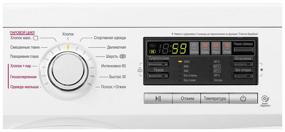 Automatic Weight Sensing точно определяет вес белья за 60 секунд — система подбирает оптимальный расход воды и электроэнергии. Например, при неполной загрузке 3 кг расход снижается на 20% благодаря технологии Eco Hybrid. Встроенный дозатор SmartThinQ автоматически распознает тип моющего средства: