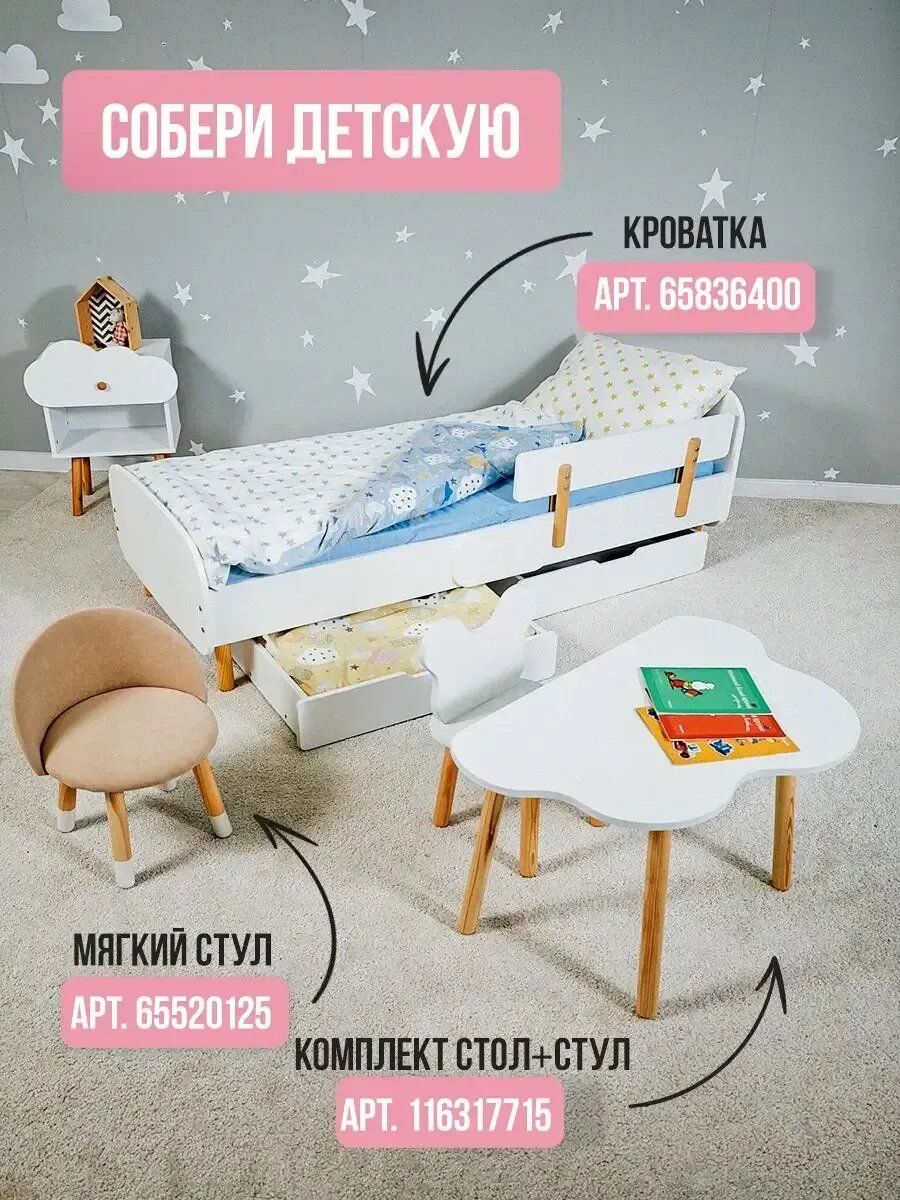 Набор DIMDOM Kids Облако+Мишка создан с учетом стандартов эргономики для детей 3-7 лет. Столешница толщиной 16 мм устойчива к пролитым краскам - верхний слой ЛДСП класса E0 обработан полимерной пленкой с коэффициентом абразивной стойкости 7.5 по шкале ИСО 4586. Наклонное основание ножек из сосны (сечение 40х40 мм) обеспечивает распределение нагрузки до 50 кг/опора - вдвое превышая стандарты безопасности ГОСТ 26682–2016.