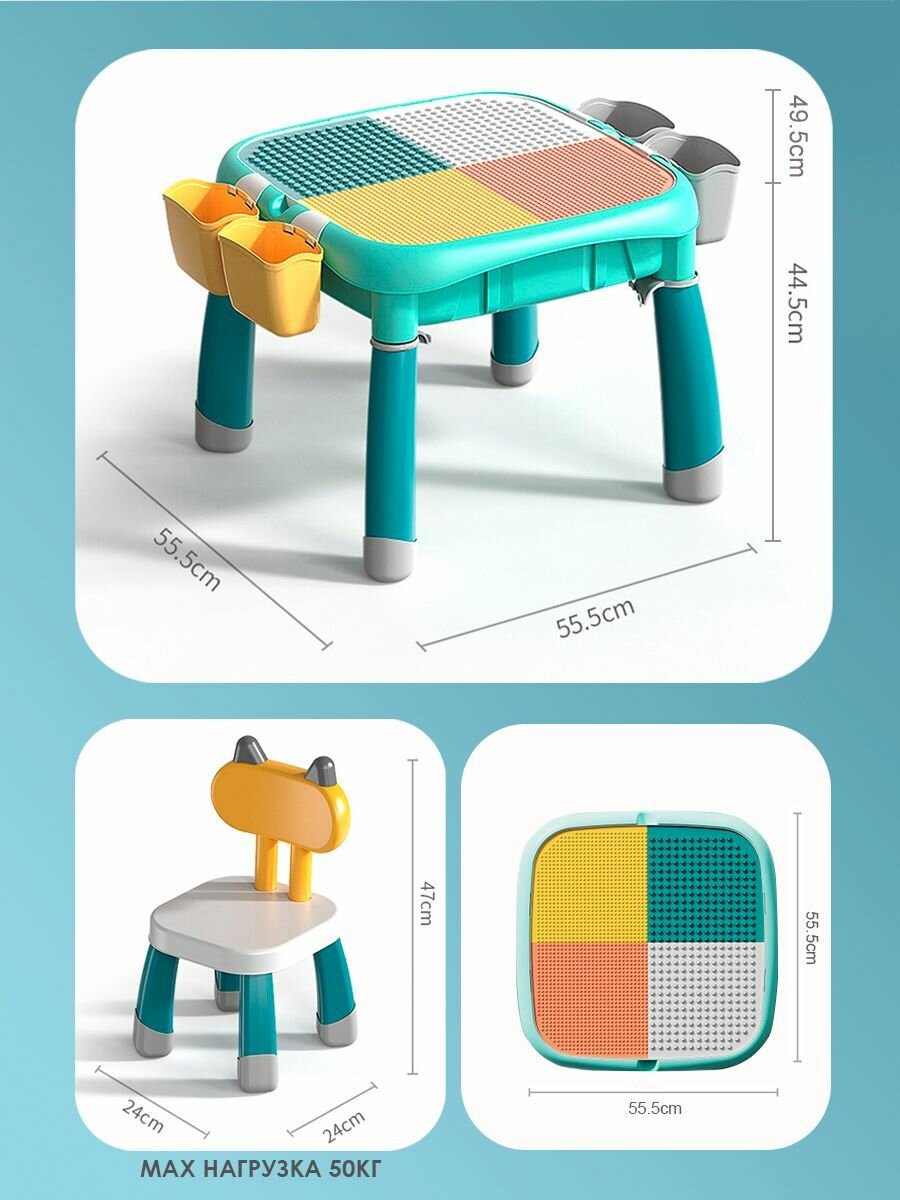 Детский стол WiMi с конструктором создает пространство для 3 типов активностей: строительства из пластиковых кирпичиков, сенсорных игр с песком и водных экспериментов. Комплект заменяет сразу 3 игрушки благодаря съёмной столешнице с высокими бортиками (4.5 см) и перфорированным дном для слива воды. В отличие от аналогов типа Ikea FLISAT, здесь конструкторная база интегрирована прямо в столешницу.