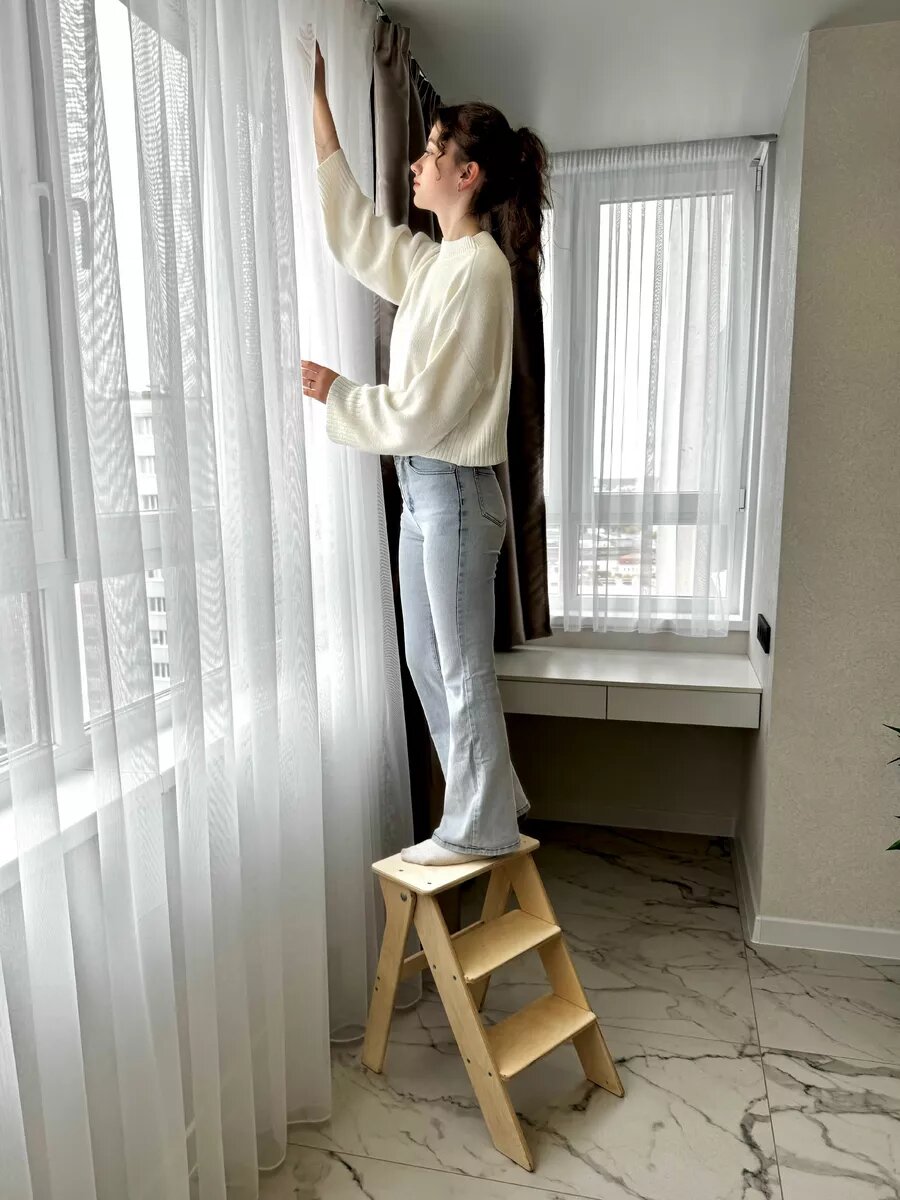 Складной табурет-стремянка из массива дерева решает три задачи: компактное хранение кухонной подставки, безопасный доступ к верхним полкам и посадка 2 человек одновременно. В отличие пластиковых аналогов, деревянный каркас из карельской березы не прогибается при нагрузке 150 кг за счет стабилизирующих стальных пластин в основаниях ступеней.