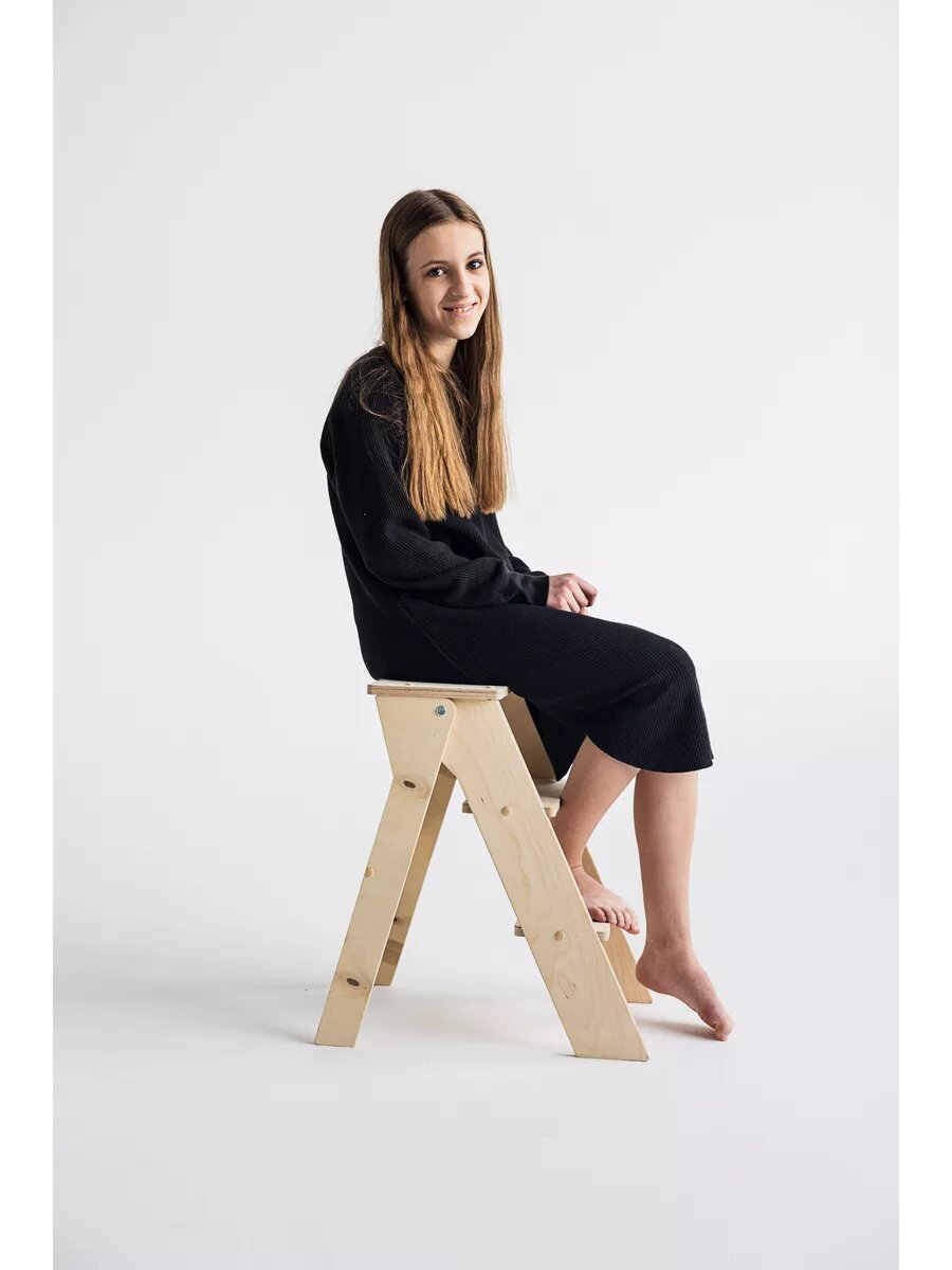 Деревянный стул-стремянка ONCELI сочетает три функции: сиденье для кухни, трехступенчатую лестницу и компактную систему хранения. Модель разработана для нагрузок до 120 кг благодаря усиленному каркасу из древесины каучукового дерева. Согласно тестам производителя, двойные брусья в опорных стойках снижают риск деформации при эксплуатации.