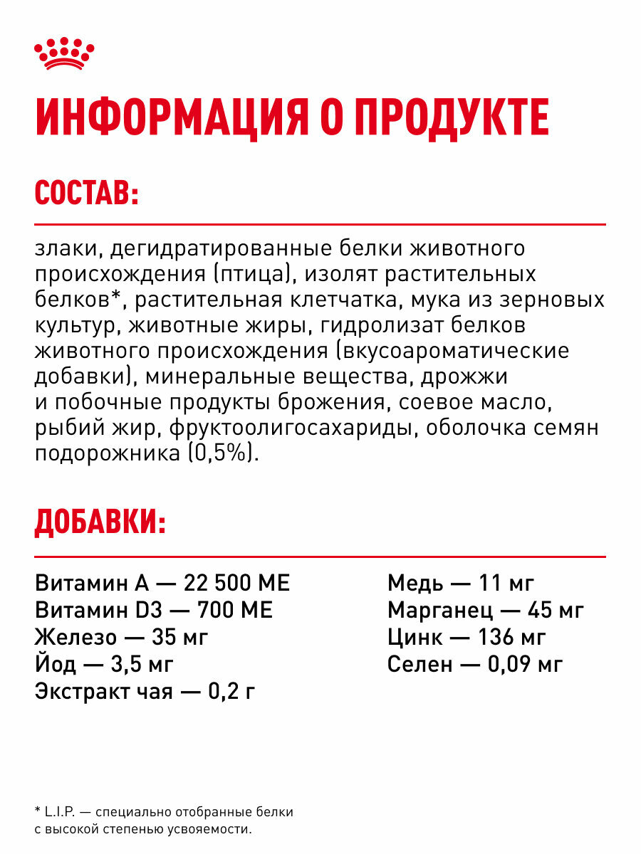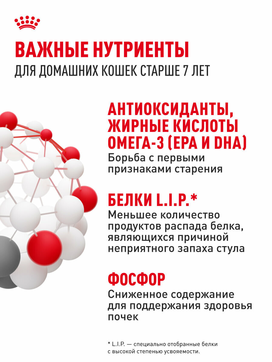 После 7 лет у кошек интенсивность обмена веществ снижается на 15-20%, а риск ожирения увеличивается в 3 раза при кастрации. Royal Canin Indoor 7+ создан с учётом физиологии малоподвижных животных: ограниченная калорийность (3780 ккал/кг) сочетается с высоким содержанием белка (30%) при снижении жиров до 11%. Специально разработанная формула содержит: