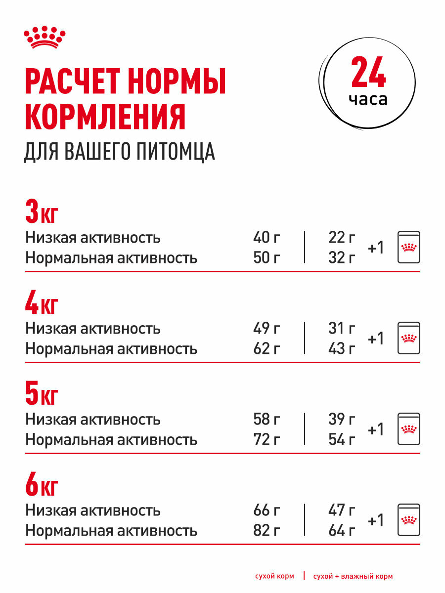 Пример для животного 5 кг: (30 x 5) + 70 = 220 ккал → 60 г корма