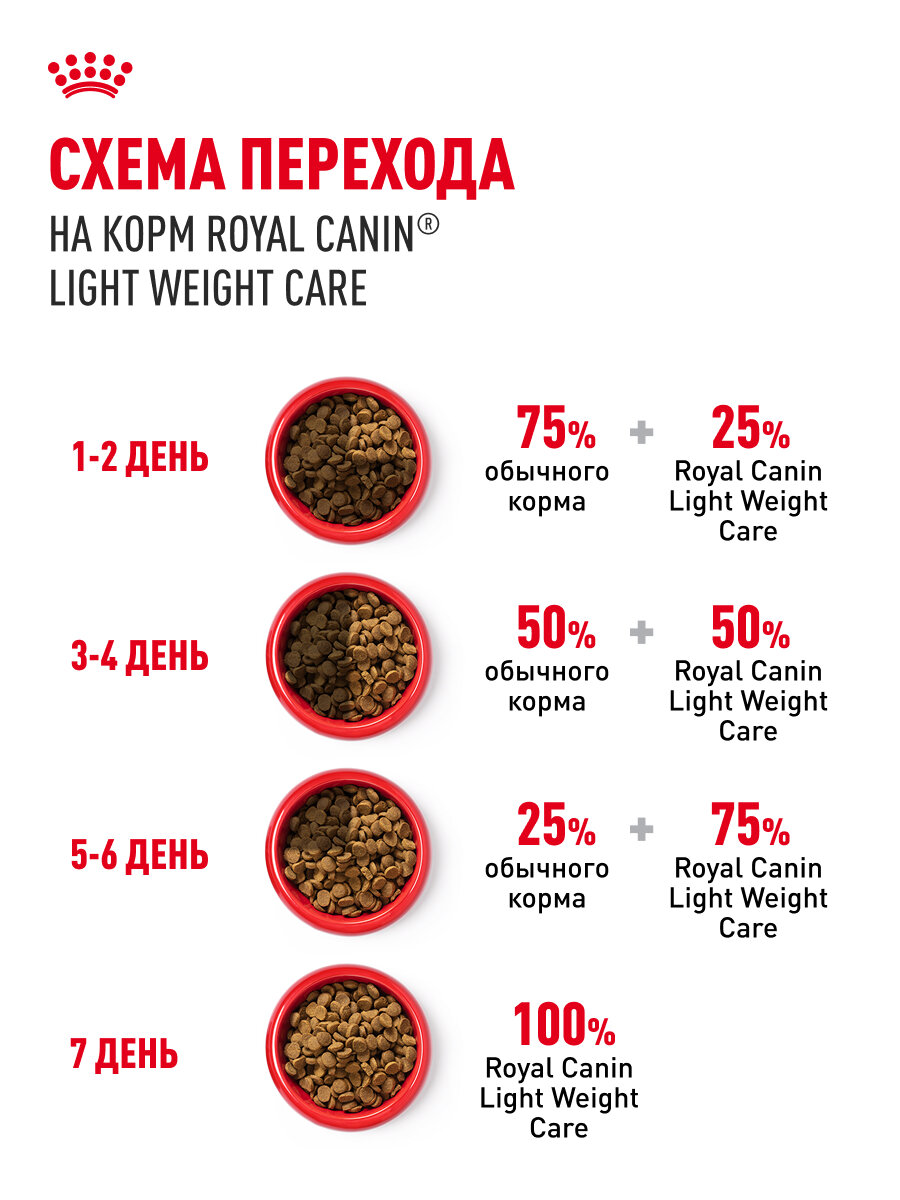 - Дни 1-2: 75% старого корма + 25% Light Weight Care