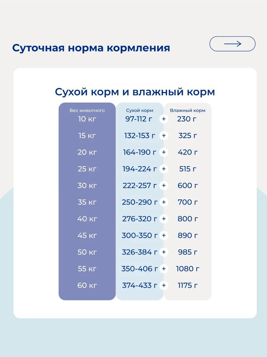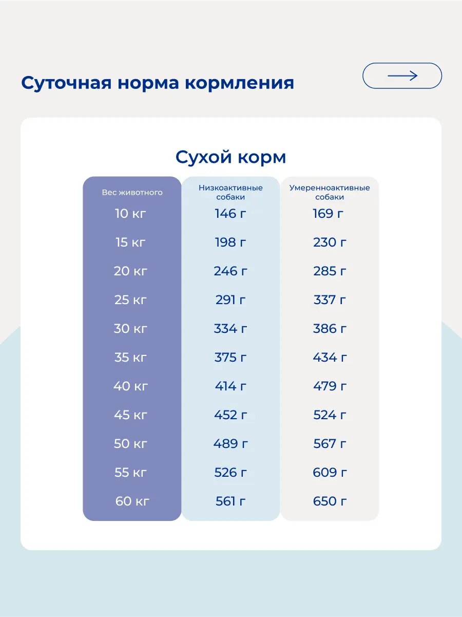 Суточные нормы для взрослых собак средних пород (вес 15-25 кг) составляют 180-300 г/сутки. Для крупных (свыше 40 кг) – 450-550 г с корректировкой по активности.