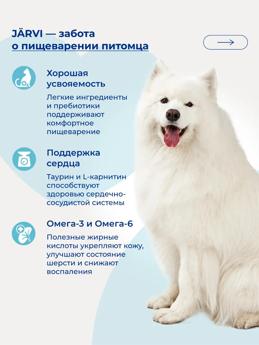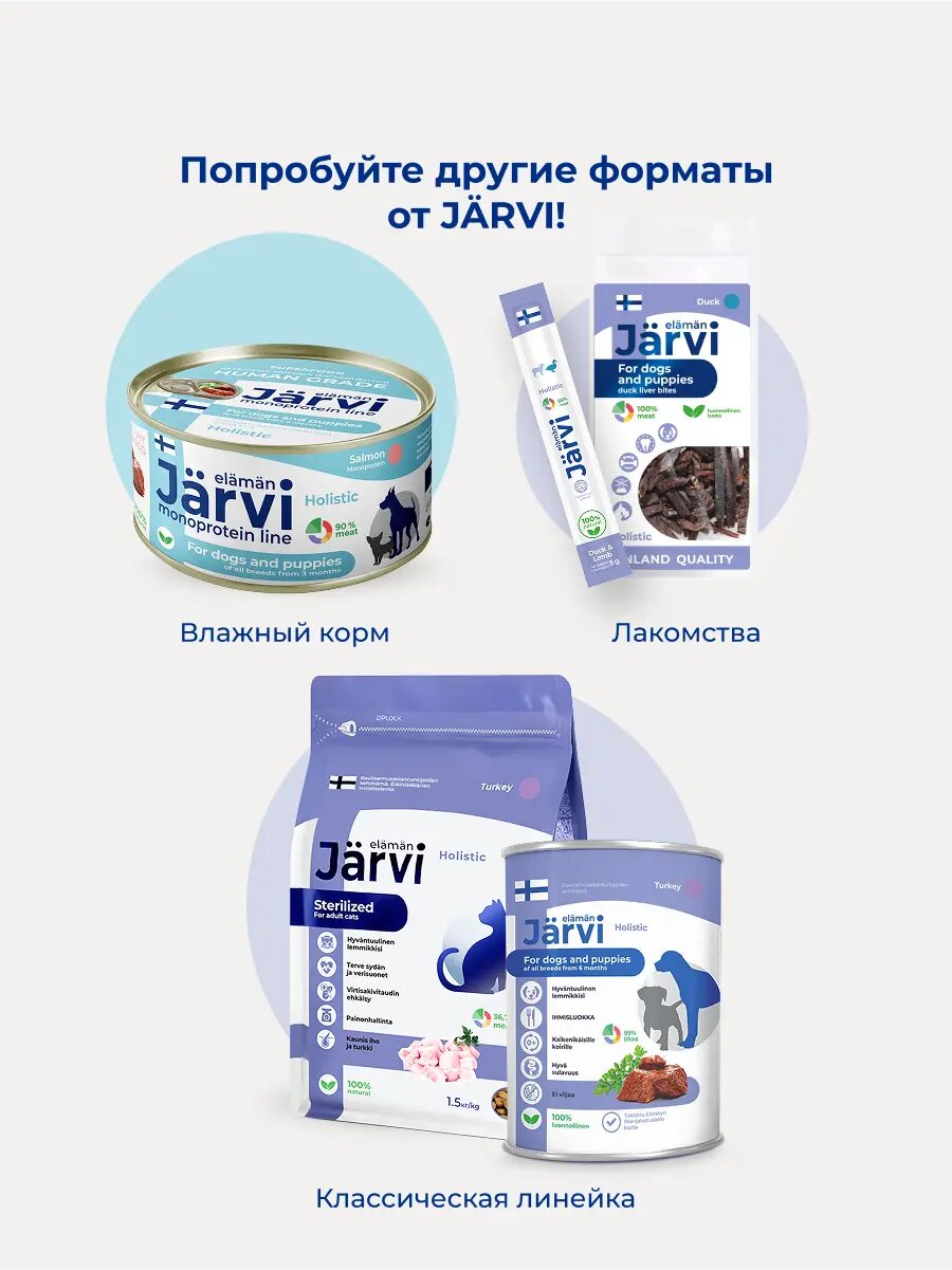 Телятина как единственный источник животного белка в корме Jarvi устраняет 92% пищевых аллергий по данным ветеринарных исследований. Концентрация сырого протеина – 28%, жира – 15% – оптимальное соотношение для собак с недостаточной массой тела. Холистик-ингредиенты включают: