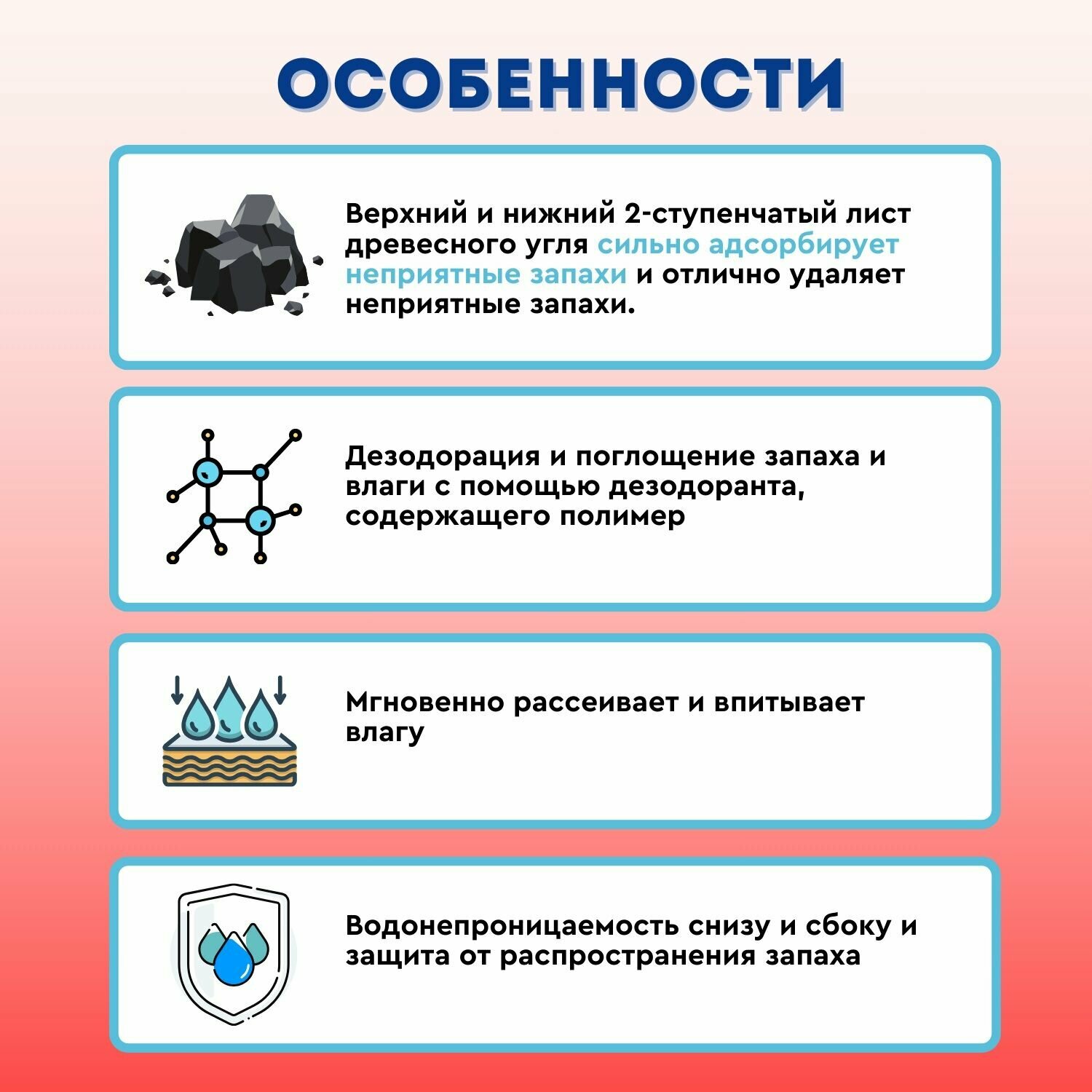 - Сравнение по абсорбции: впитывает на 40% больше жидкости, чем аналоги без угля (780 мл против 550 мл у конкурентов)