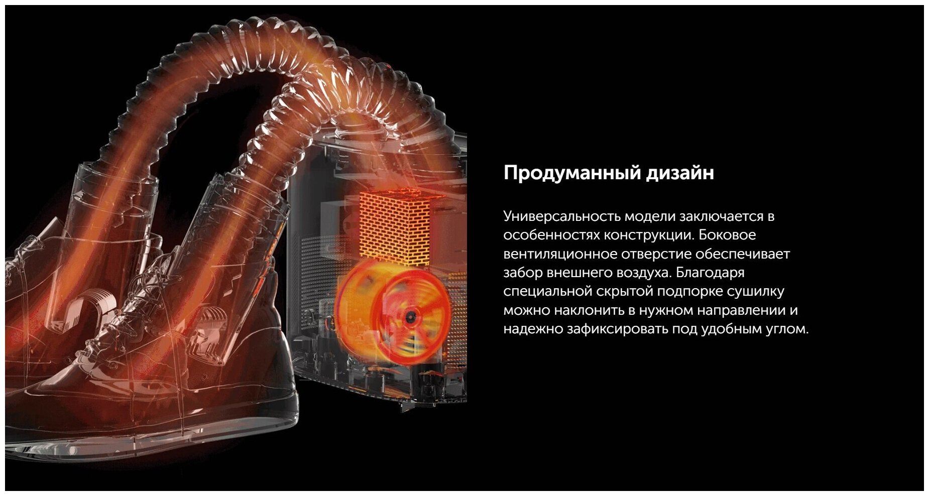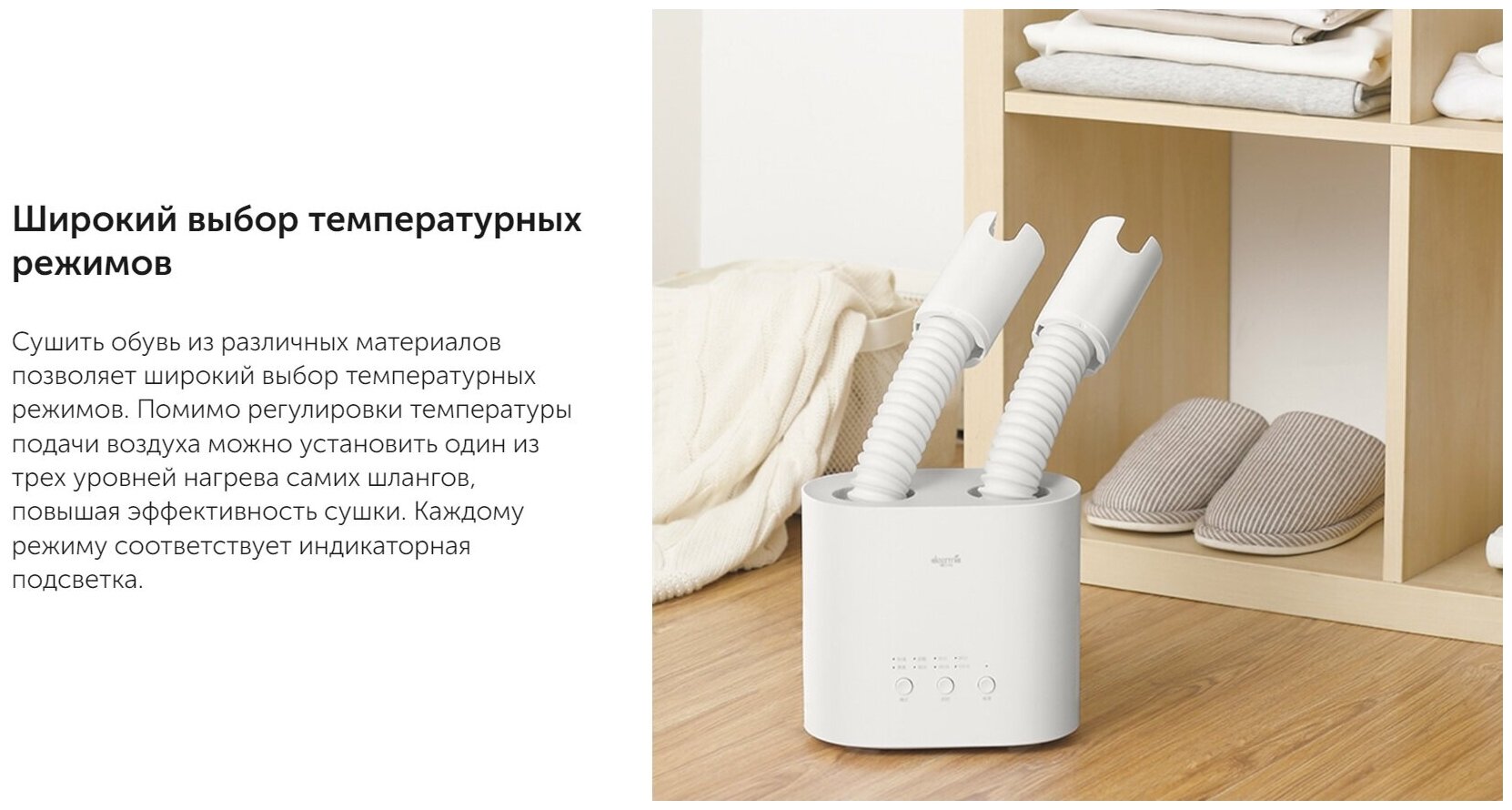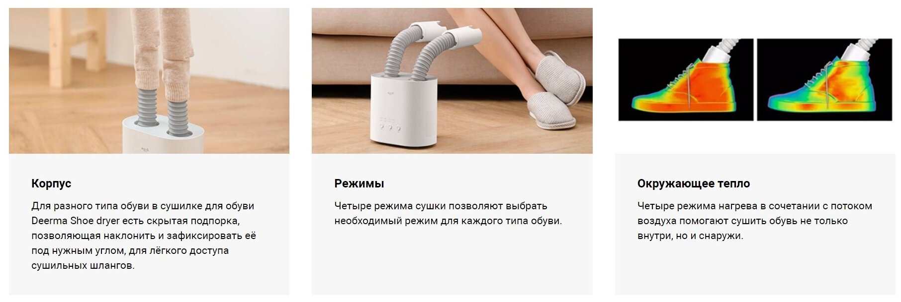 Корпус сушилки Deerma DEM-HX10W изготовлен из ударопрочного пластика ABS с температурной устойчивостью до 150°C. Внутренняя конструкция включает: