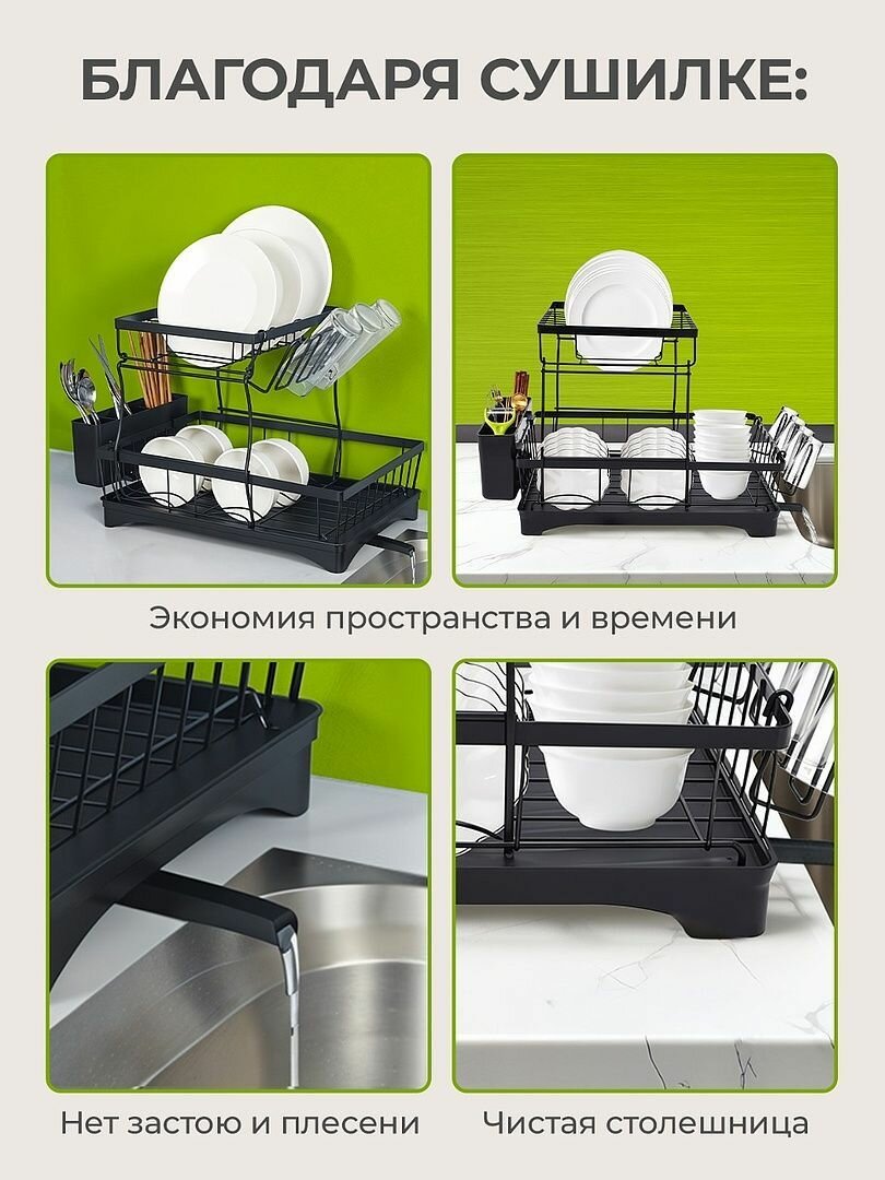 Два яруса позволяют одновременно сушить до 10 тарелок, 4 кружки и набор столовых приборов. Нижний уровень выдерживает нагрузку 4.5 кг — это на 18% больше, чем у модели IKEA VARIERA.