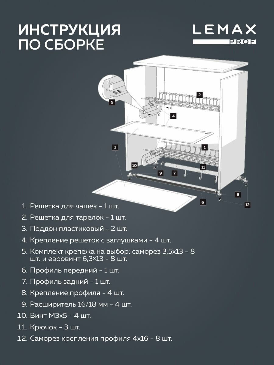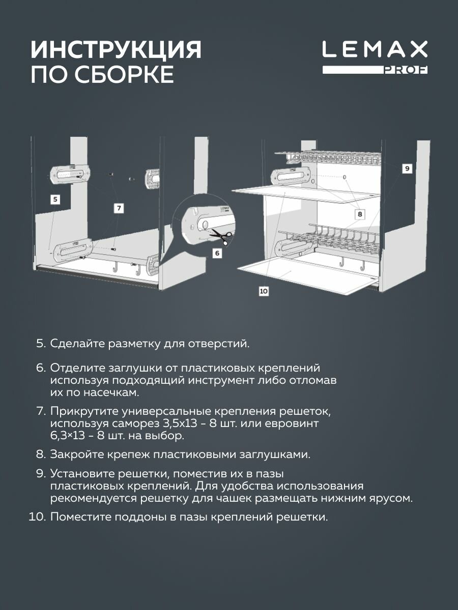 Сушилка Lemax 600 мм создана из нержавеющей стали AISI 304, устойчивой к воздействию агрессивной среды кухни. Металлическая рама обеспечивает срок службы более 10 лет при регулярной эксплуатации. Глубокий пластиковый поддон (емкость - 1,8 л) с защитным бортиком предотвращает протечки воды на мебель.