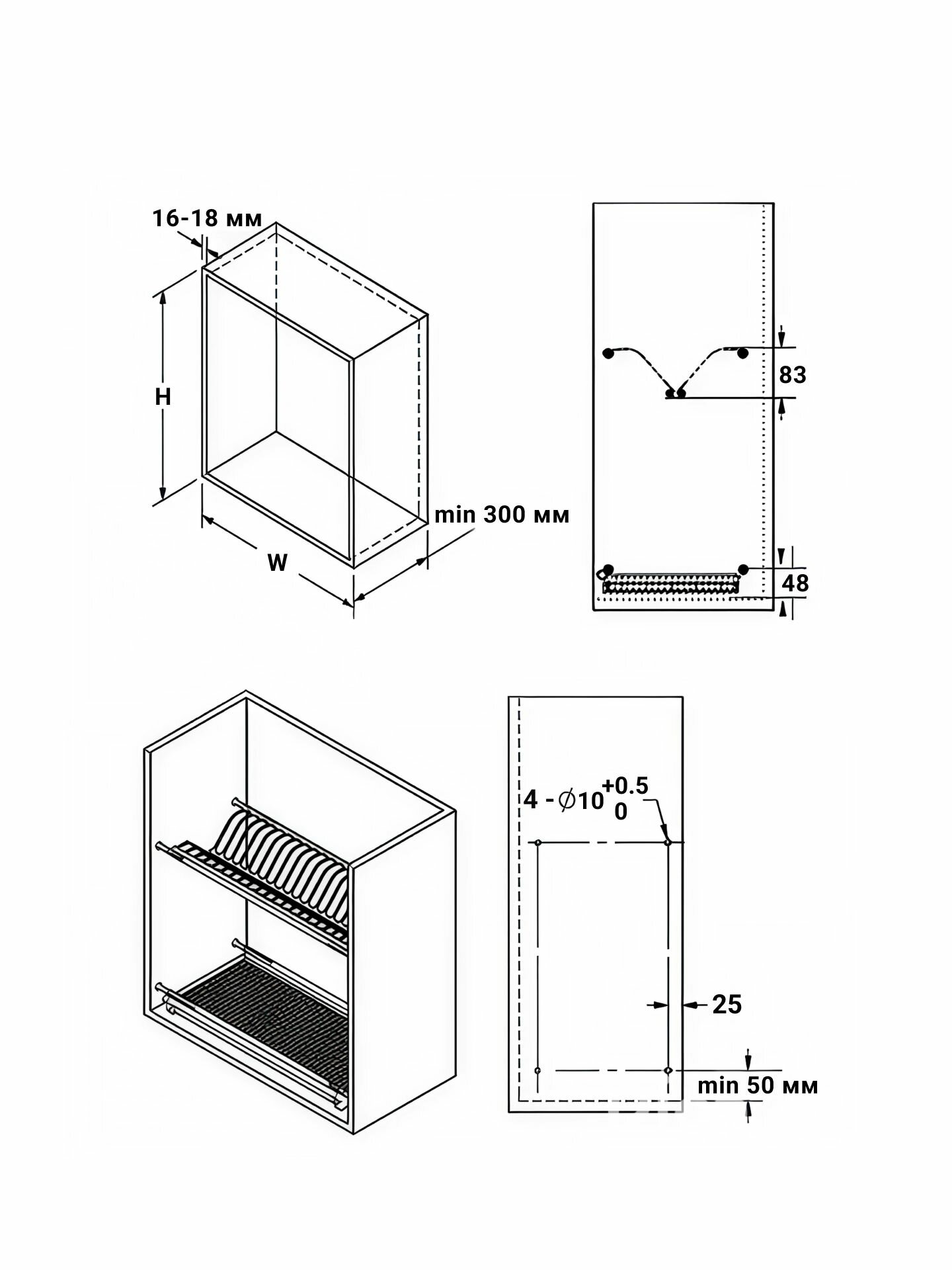 - Двухуровневая конструкция с регулируемым расстоянием между полками (25-40 см) выдерживает до 18 кг посуды. Прутья расположены под углом 5° для самопроизвольного стока воды.