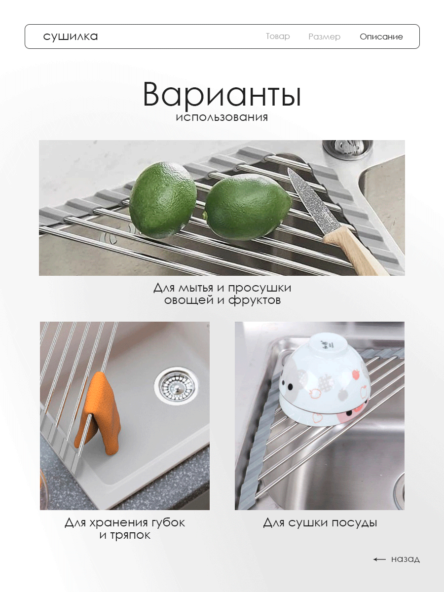 Сушилка-решетка с угловой конфигурацией разработана для раковин 40х40 и 50х50 см. Основу составляет перфорированная поверхность из нержавеющей стали AISI 304 (толщина 1.2 мм по ГОСТ 5632-2014), гарантирующая: