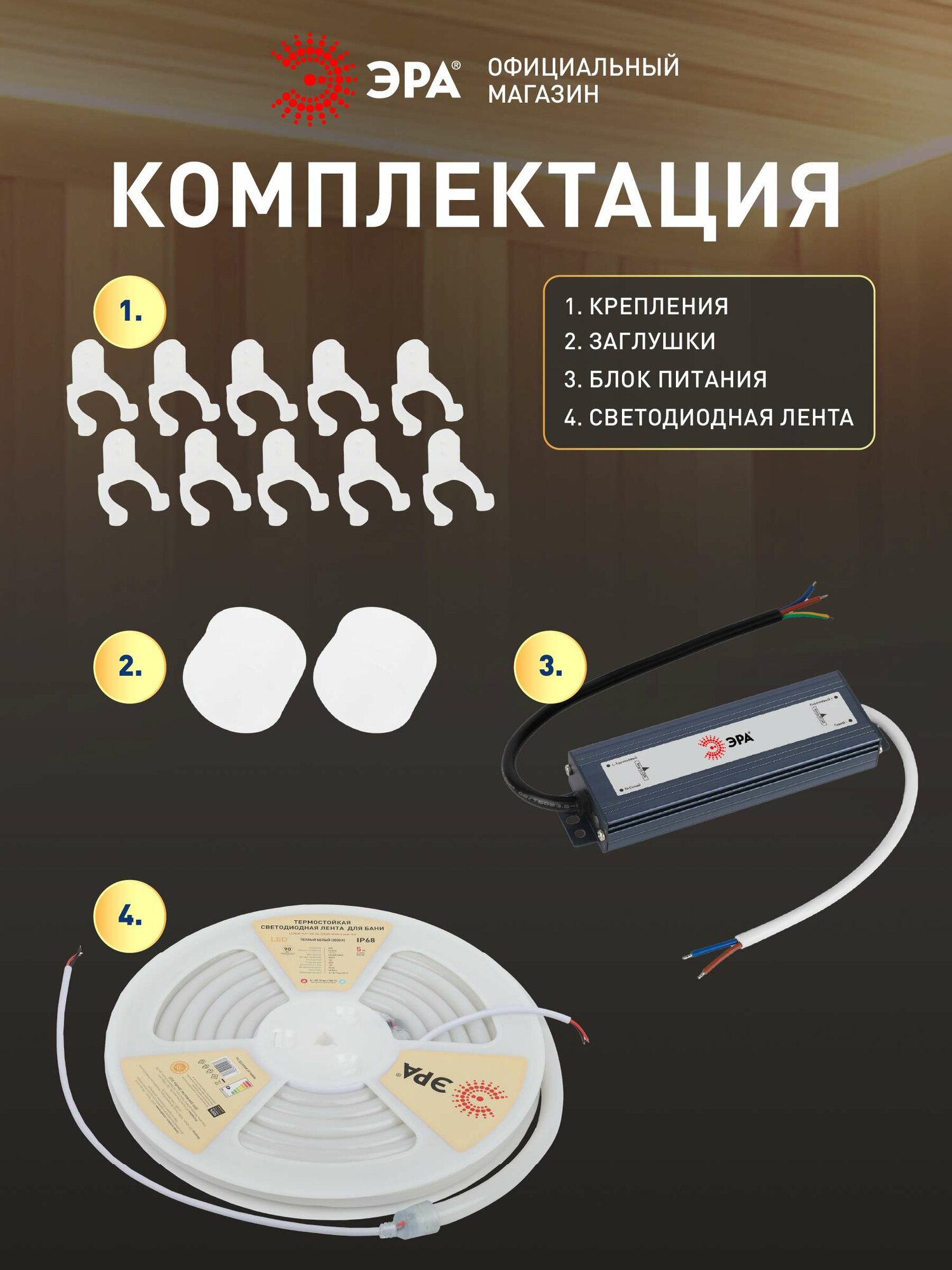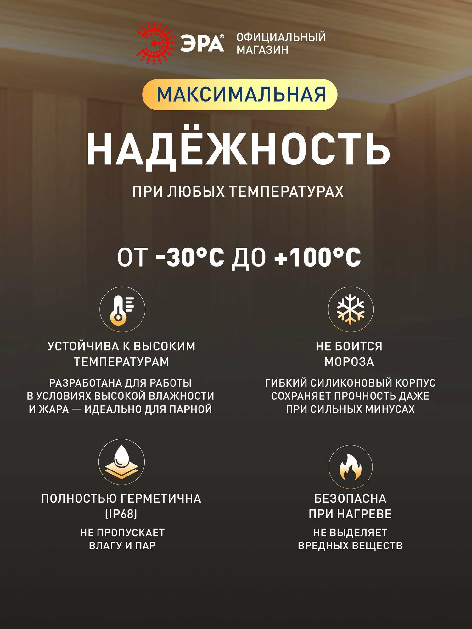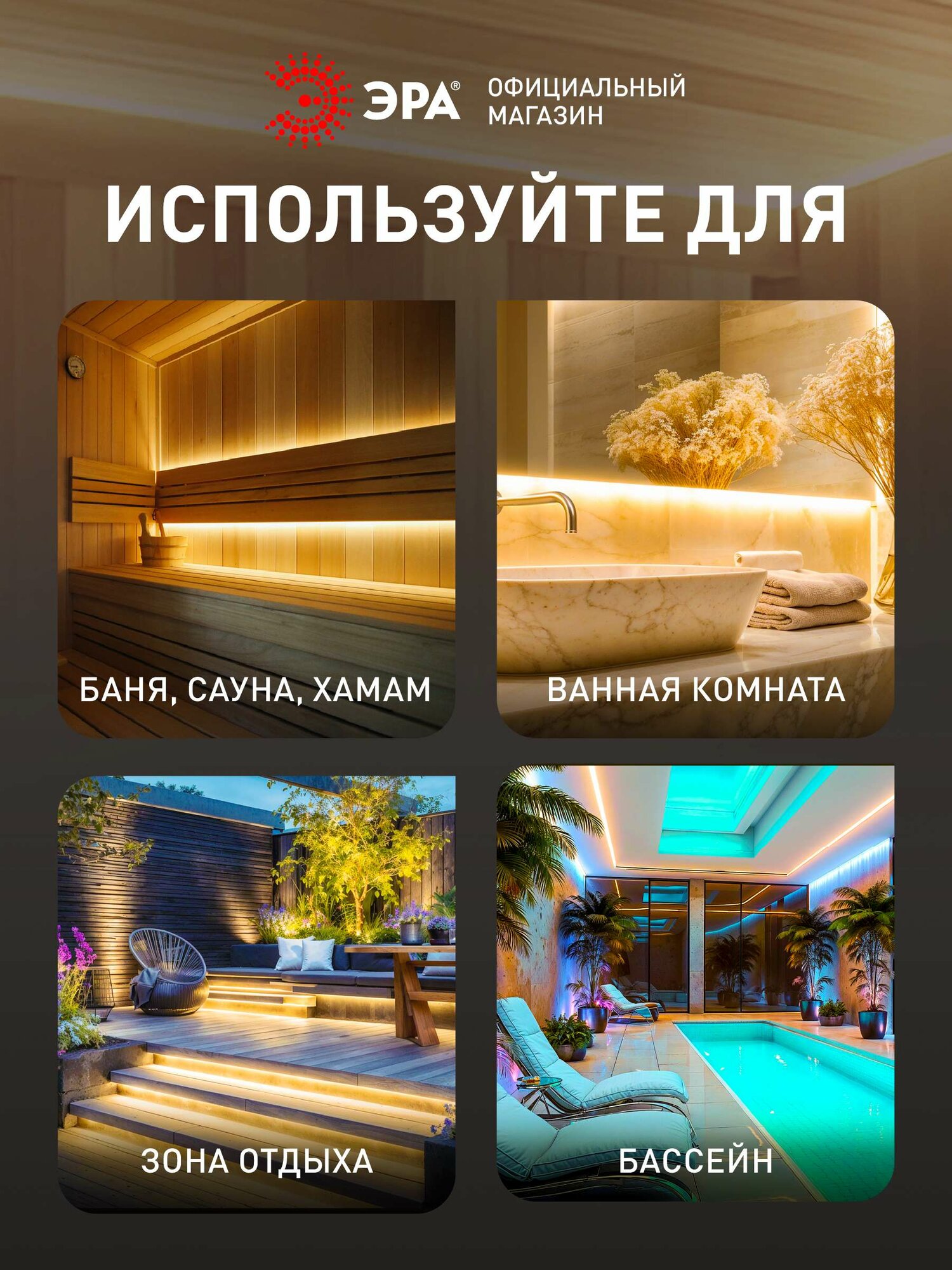 Светодиодная лента ЭРА 2835 специально разработана для эксплуатации в влажных помещениях и парилках с рабочей температурой до +80°C. Благодаря степени защиты IP68 и двойному силиконовому покрытию, электронные компоненты полностью изолированы от пара и брызг воды. В отличие от стандартных светодиодных лент IP65, используемых в бытовых условиях, данная модель прошла дополнительные испытания на термостойкость в климатической камере НИИ Сантехники.