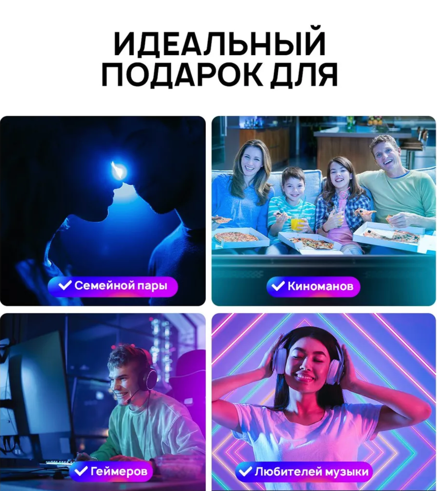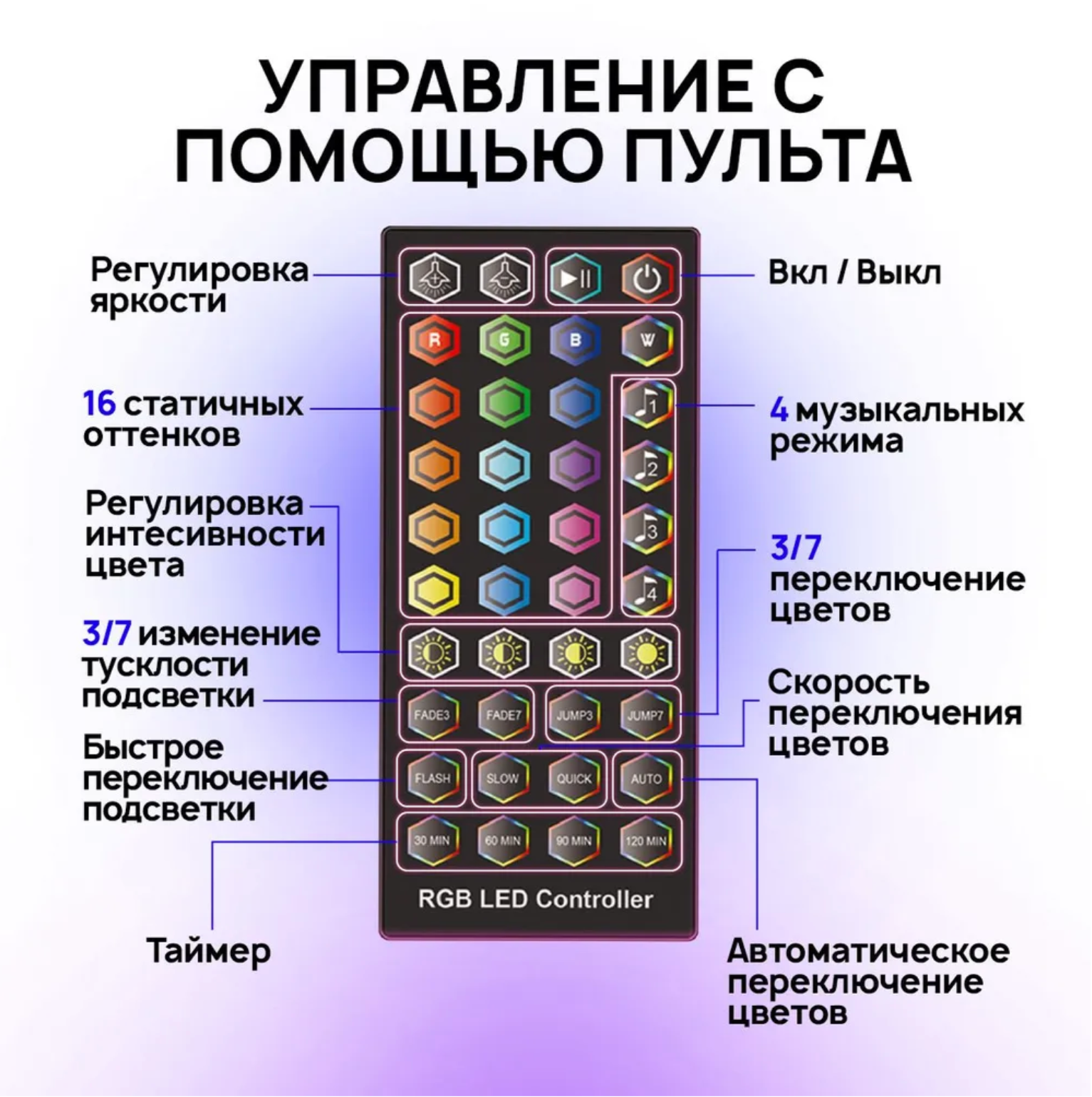 - 4 режима реакции: импульсный (стробоскоп), плавный (градиент), цветовые переходы, комбинированный