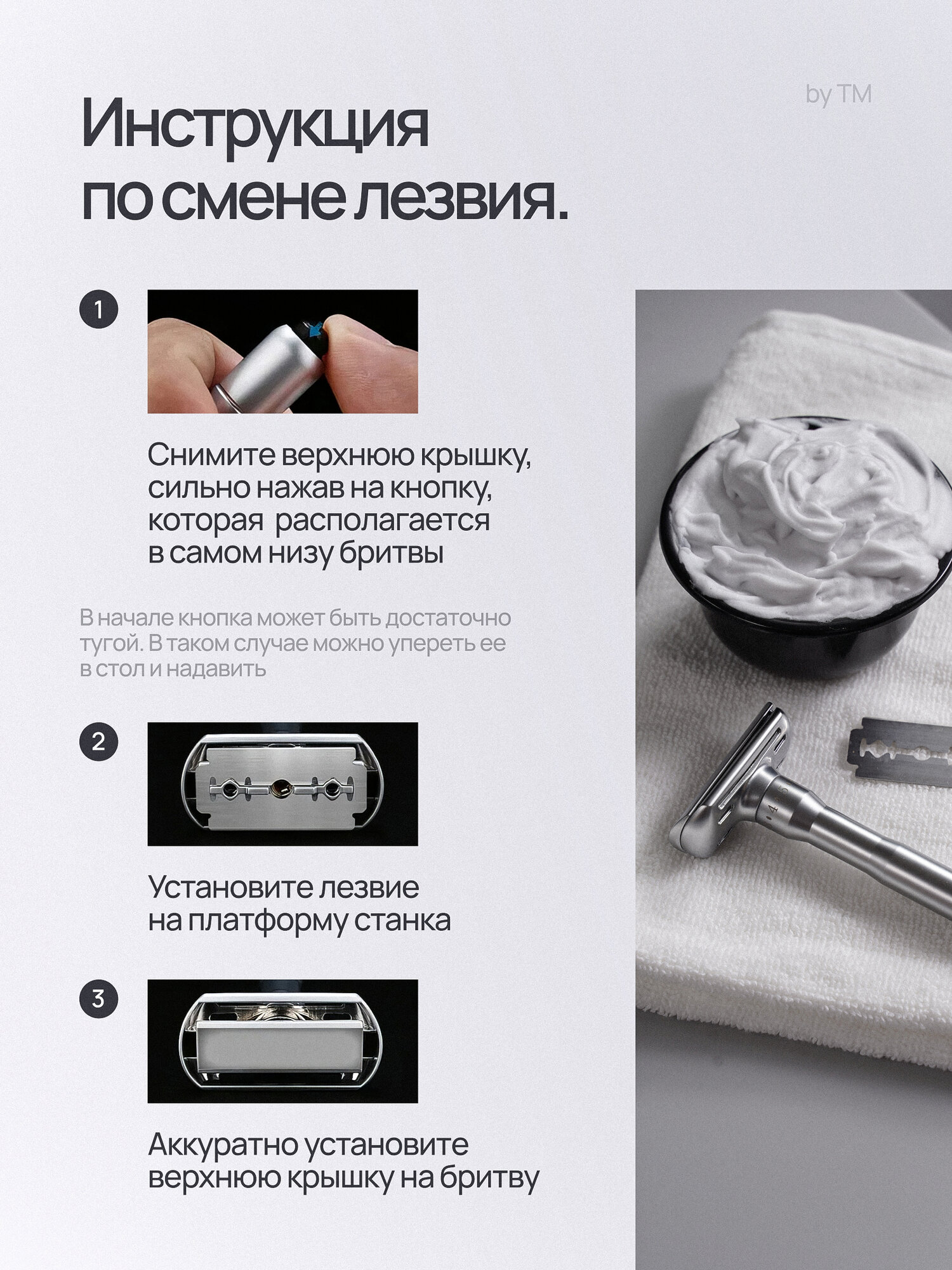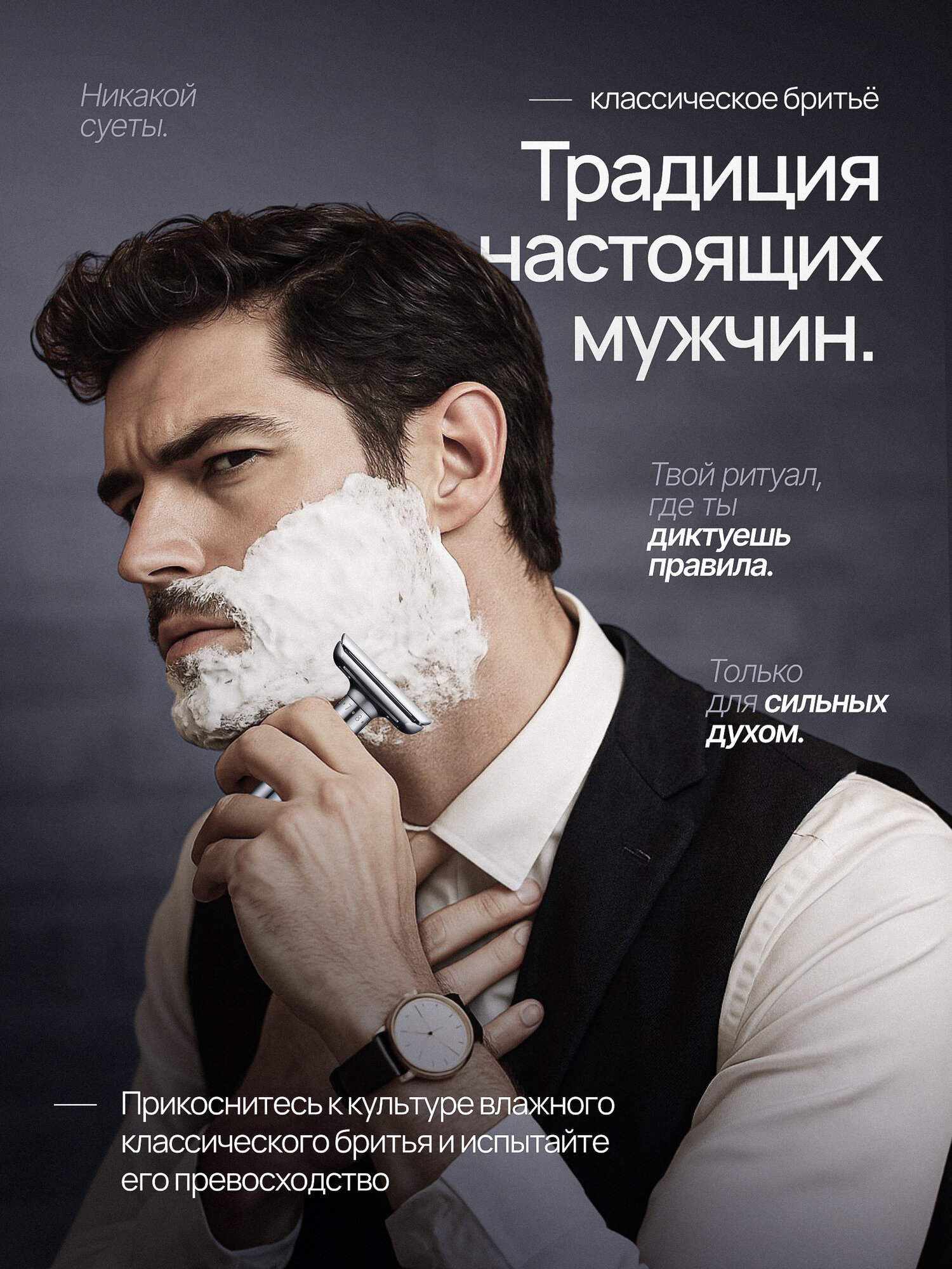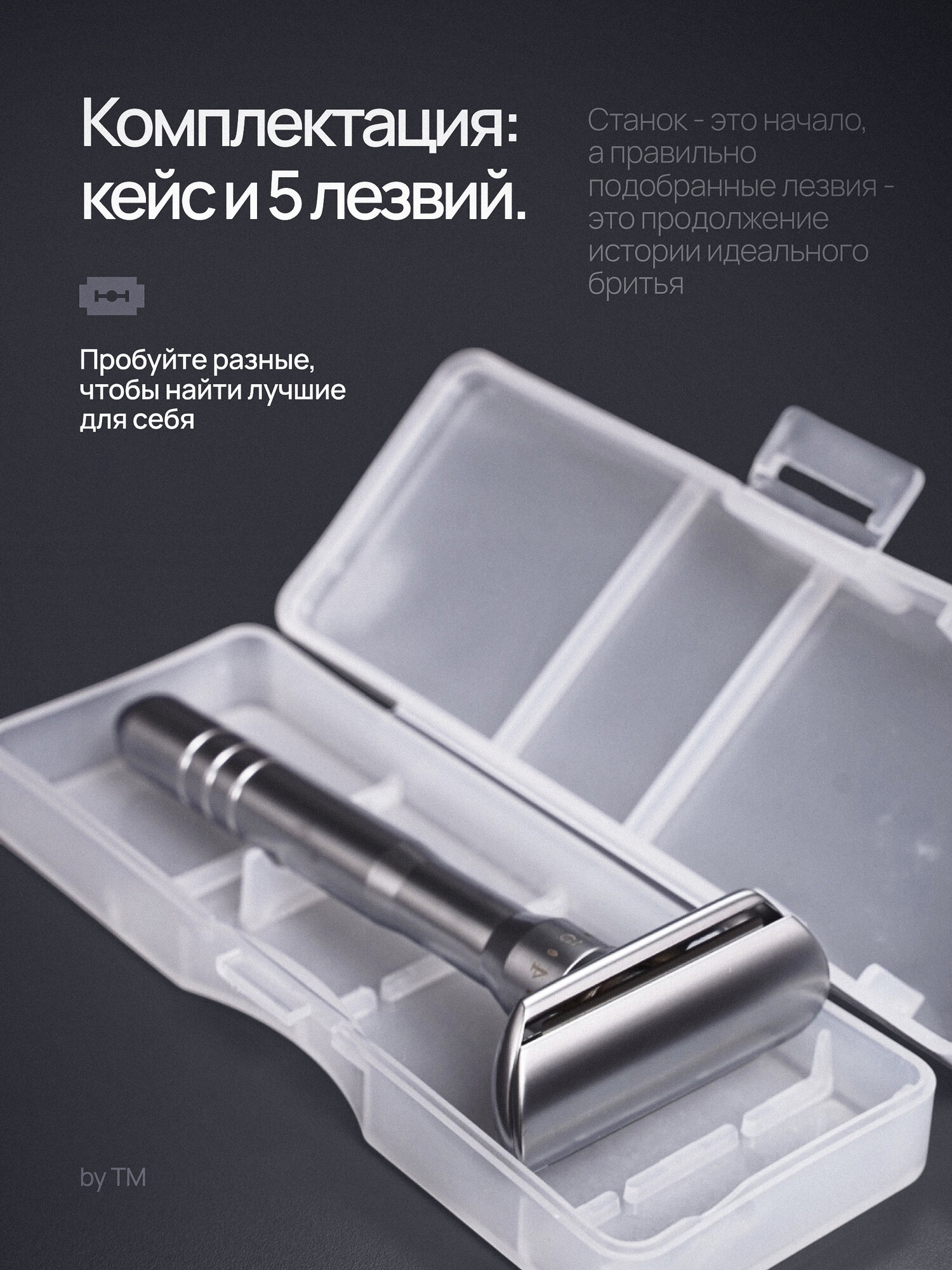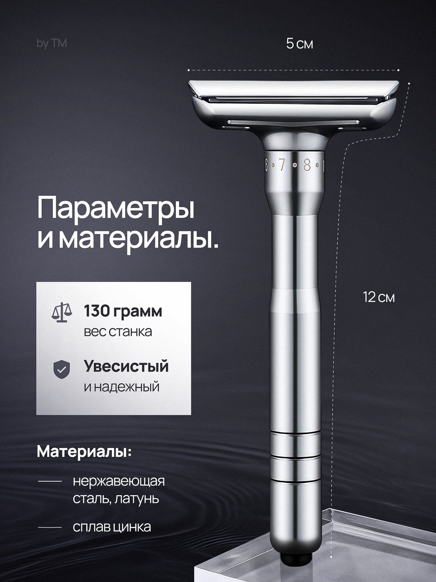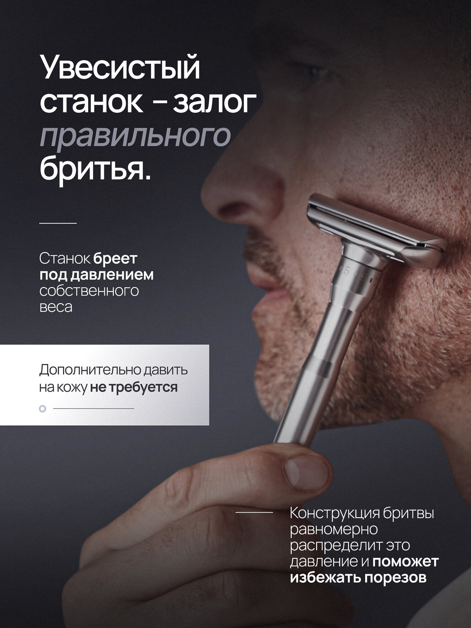 Т-образная конструкция с одинарным лезвием обеспечивает хирургическую точность бритья. Нержавеющая сталь GS-5 японского производства сохраняет остроту в 3 раза дольше обычных лезвий. Механизм регулировки угла наклона (от 30° до 45°) позволяет адаптировать бритву под индивидуальные особенности кожи.