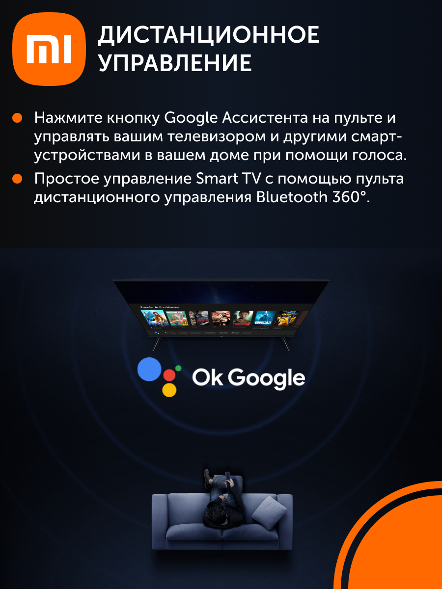 Телевизор распознаёт голосовые команды через пульт ("Окей Google, включи сериал на Кинопоиске"). В Xiaomi Mi Home доступно управление светом и розетками прямо с экрана. Для устройств Apple работают: