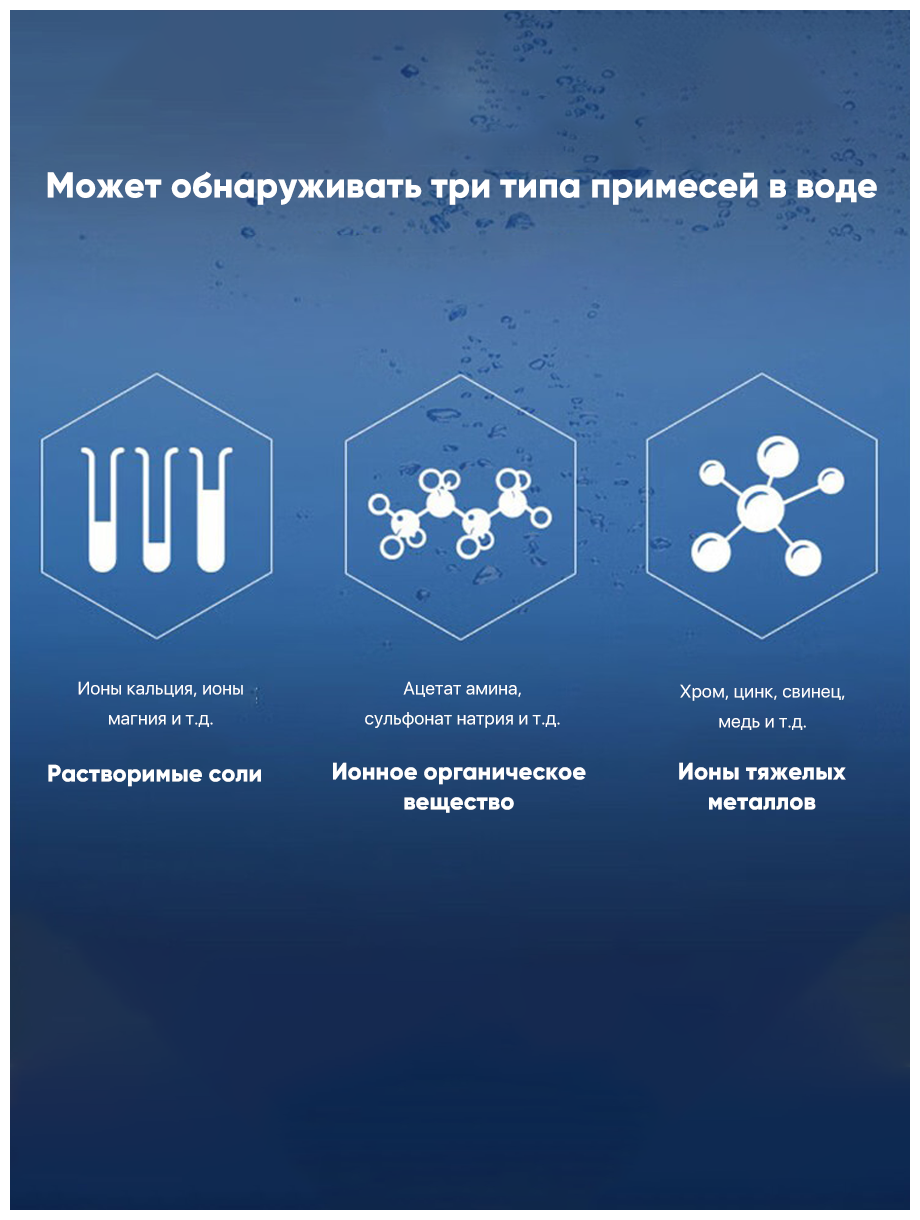 Электронный TDS-метр Xiaomi определяет общую минерализацию по электропроводности жидкости. Принцип работы основан на подаче низкого напряжения между электродами — чем выше содержание солей, тем больше ток. Шкала 0-9990 ppm охватывает все типы питьевой воды: от дистиллированной (0-50 ppm) до минеральной (свыше 500 ppm).