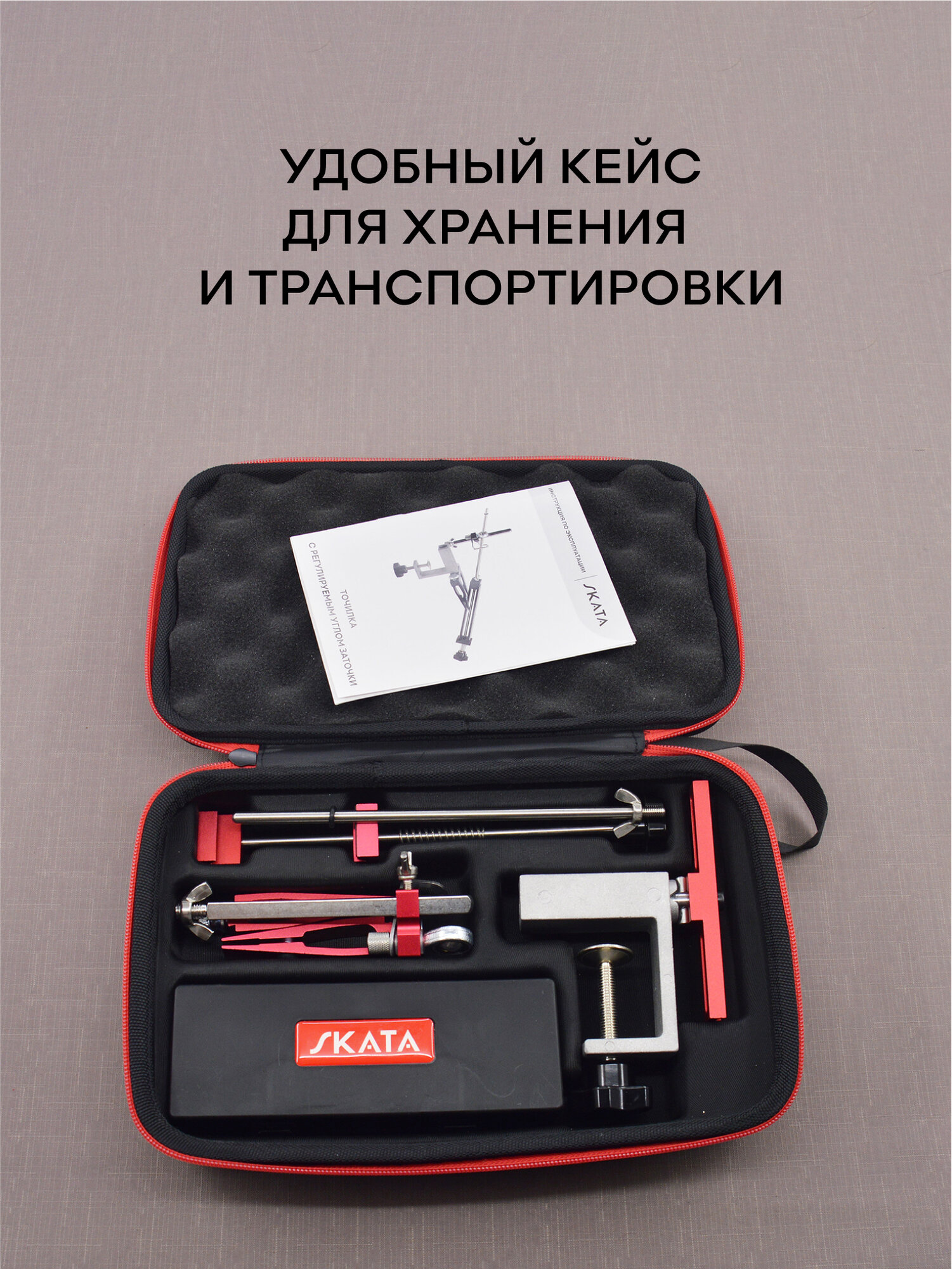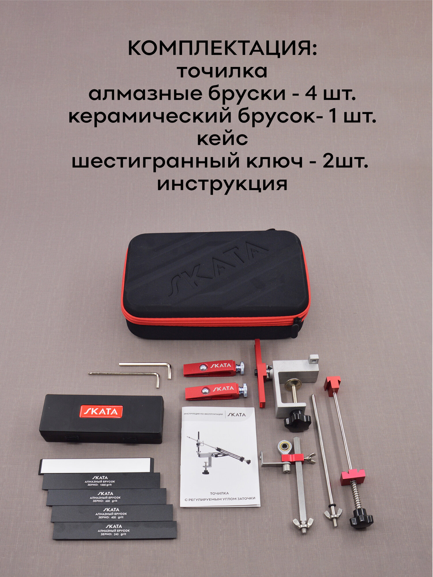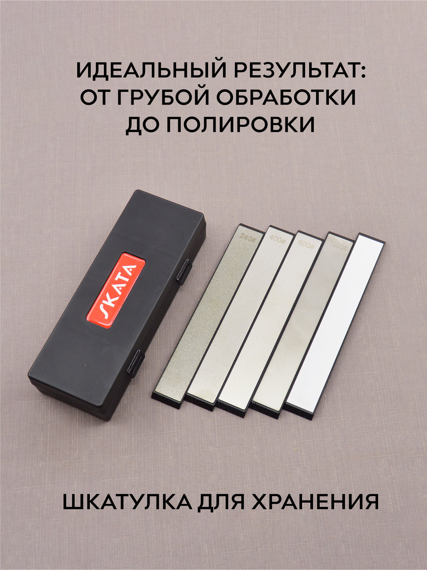 Система SKATA оснащена пятью сменными брусками с алмазным напылением: грубая обработка (240 грит), средняя (400-600 грит) и финишная зеркальная полировка (1000-2000 грит). Искусственный алмаз и керамическая основа обеспечивают в 5 раз больший ресурс по сравнению с корундовыми аналогами – тесты показали возможность заточить до 2000 лезвий без замены элементов.