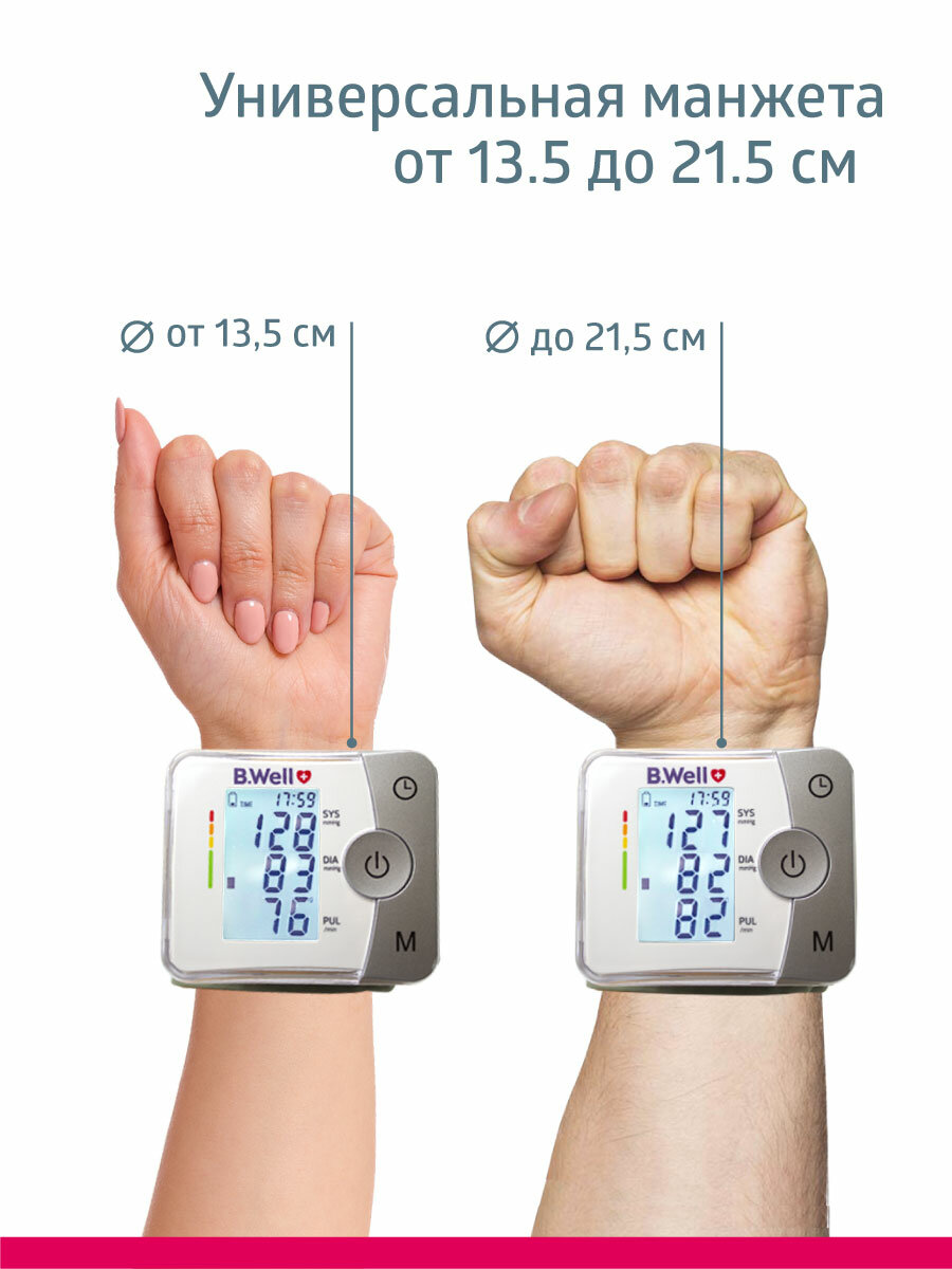 Тонометр MED-57 от B.Well проходит регулярную калибровку по протоколам Всемирной организации здравоохранения (ВОЗ), обеспечивая погрешность не более ±3 мм рт. ст. Универсальная манжета подстраивается под запястья 13.5-21.5 см благодаря трёхслойному нейлону с памятью формы, что подтверждено исследованиями НИИ кардиологии.