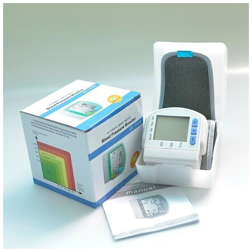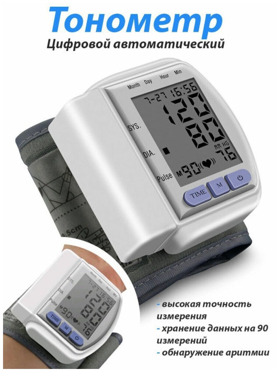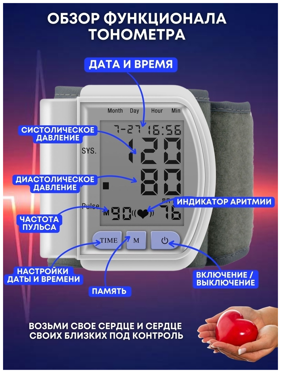 Запястный автоматический тонометр обеспечивает точное измерение давления по осциллометрическому методу с погрешностью ≤3 мм рт. ст. Устройство определяет: