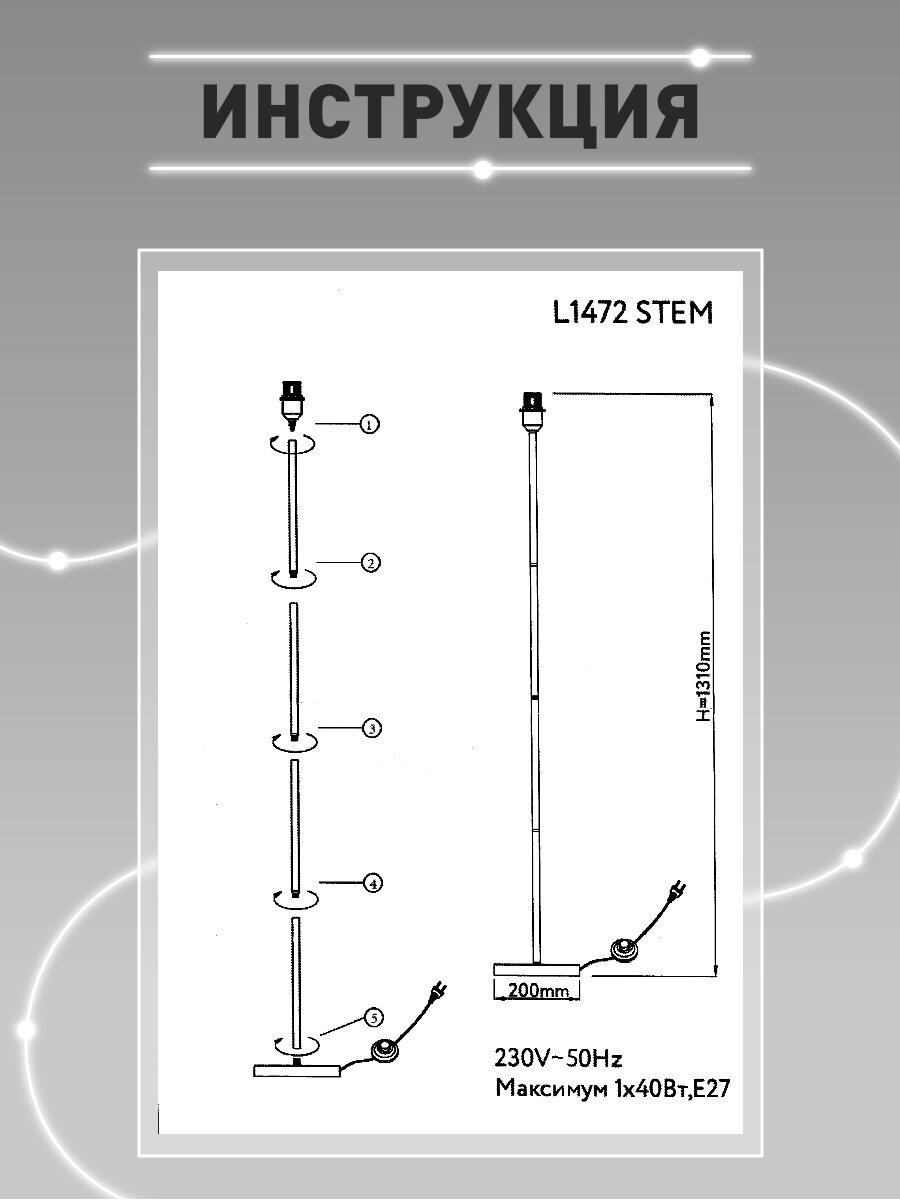 Цоколь E27 в модели L1472 STEM поддерживает классические лампы накаливания и современные LED-решения. Допустимая мощность 40Вт эквивалентна 400-500 люменам - оптимально для локального освещения зоны чтения или мягкой подсветки дивана. Конструкция без абажура позволяет: