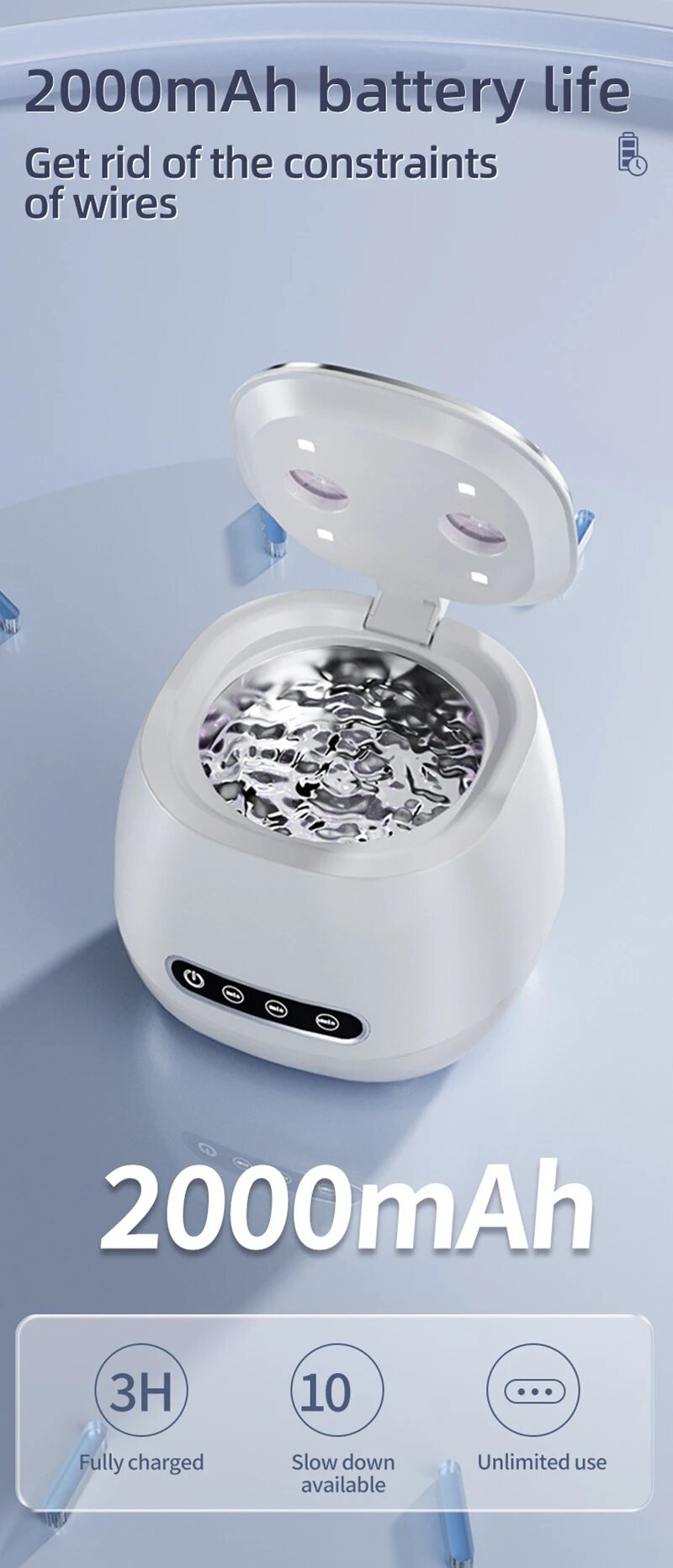 Батарея 2000 мАч обеспечивает 12 циклов очистки по 3 минуты на одном заряде. Параметры контейнера:
