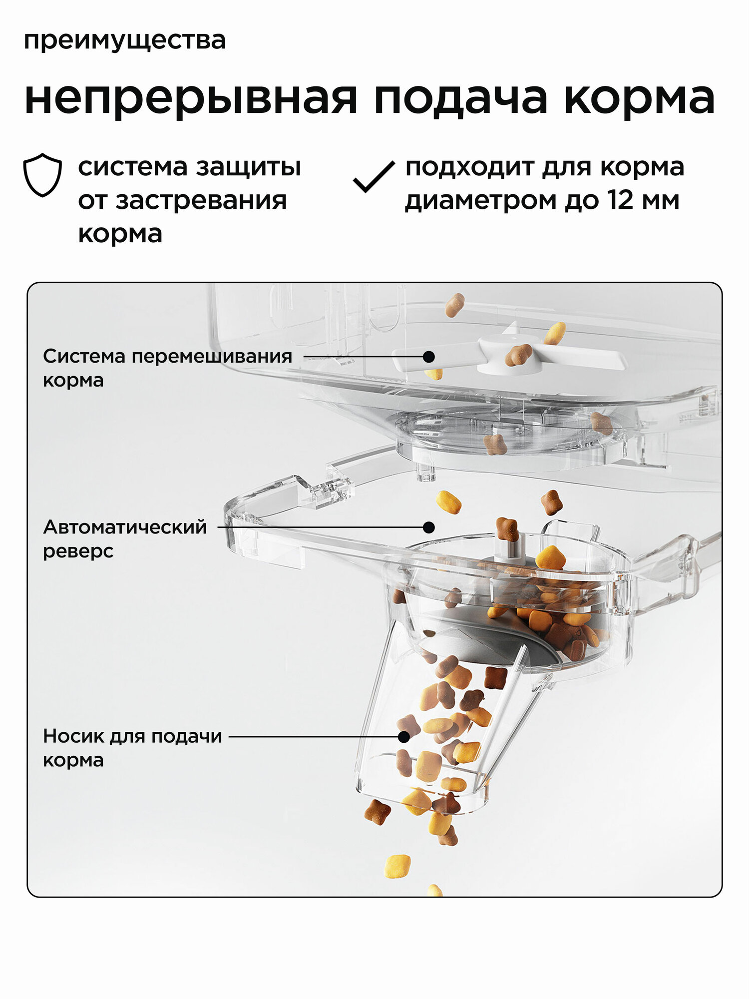 - Датчики препятствий для остановки при застревании корма