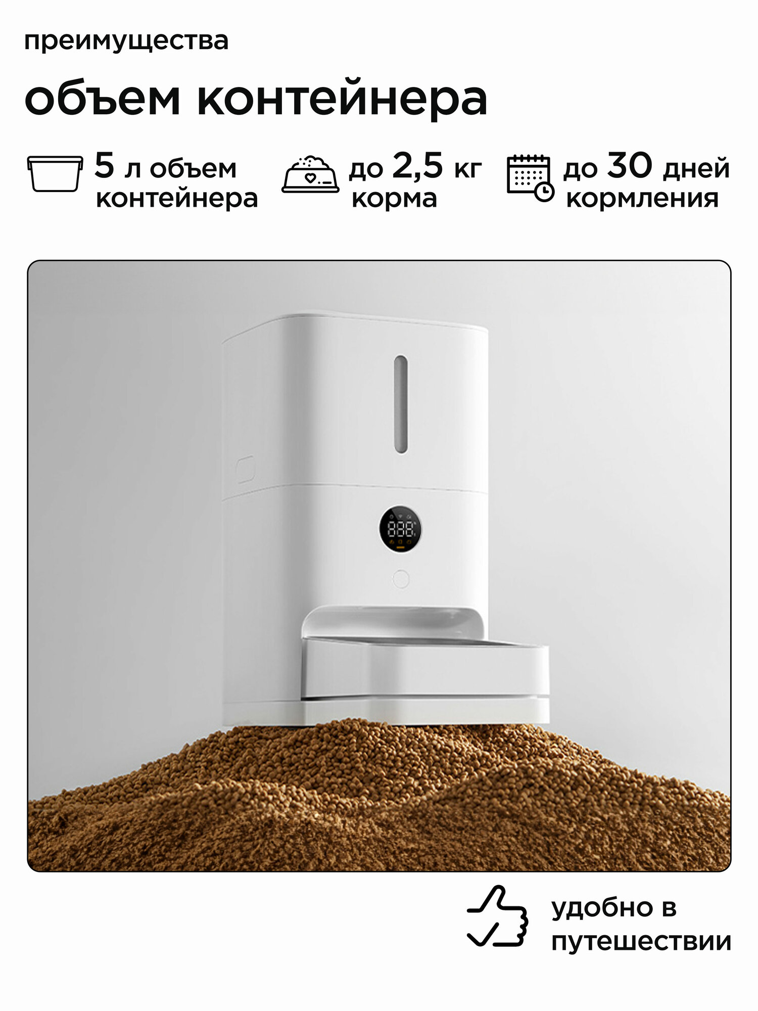 - Глубина контейнера 24 см позволяет хранить 4.5 кг сухого корма (сравните с 3.2L у PetWant)
