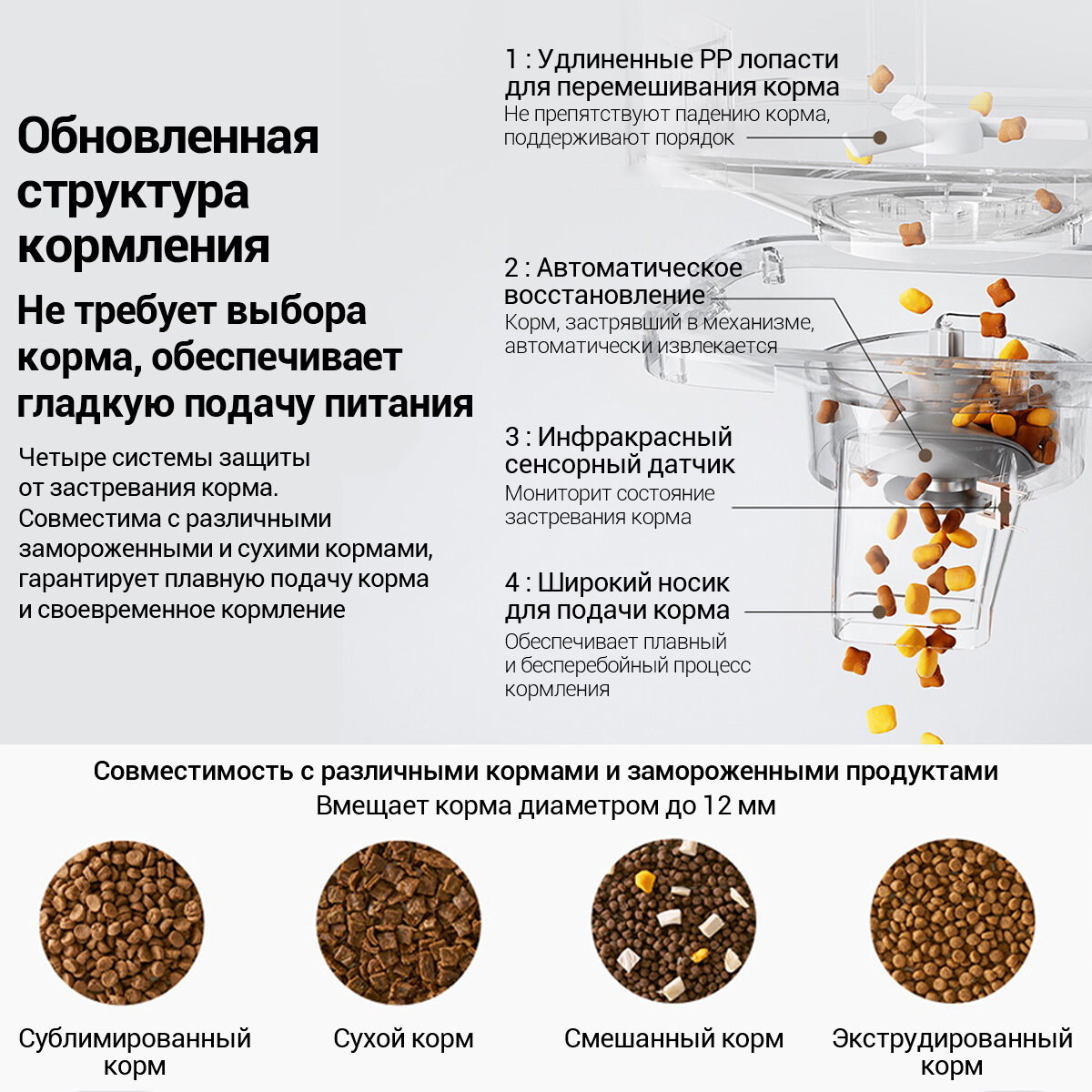 весовым дозатором (±2г точности), что позволяет точно контролировать порции. Система работает с сухими кормами фракцией до 15мм (Royal Canin, Purina One).
