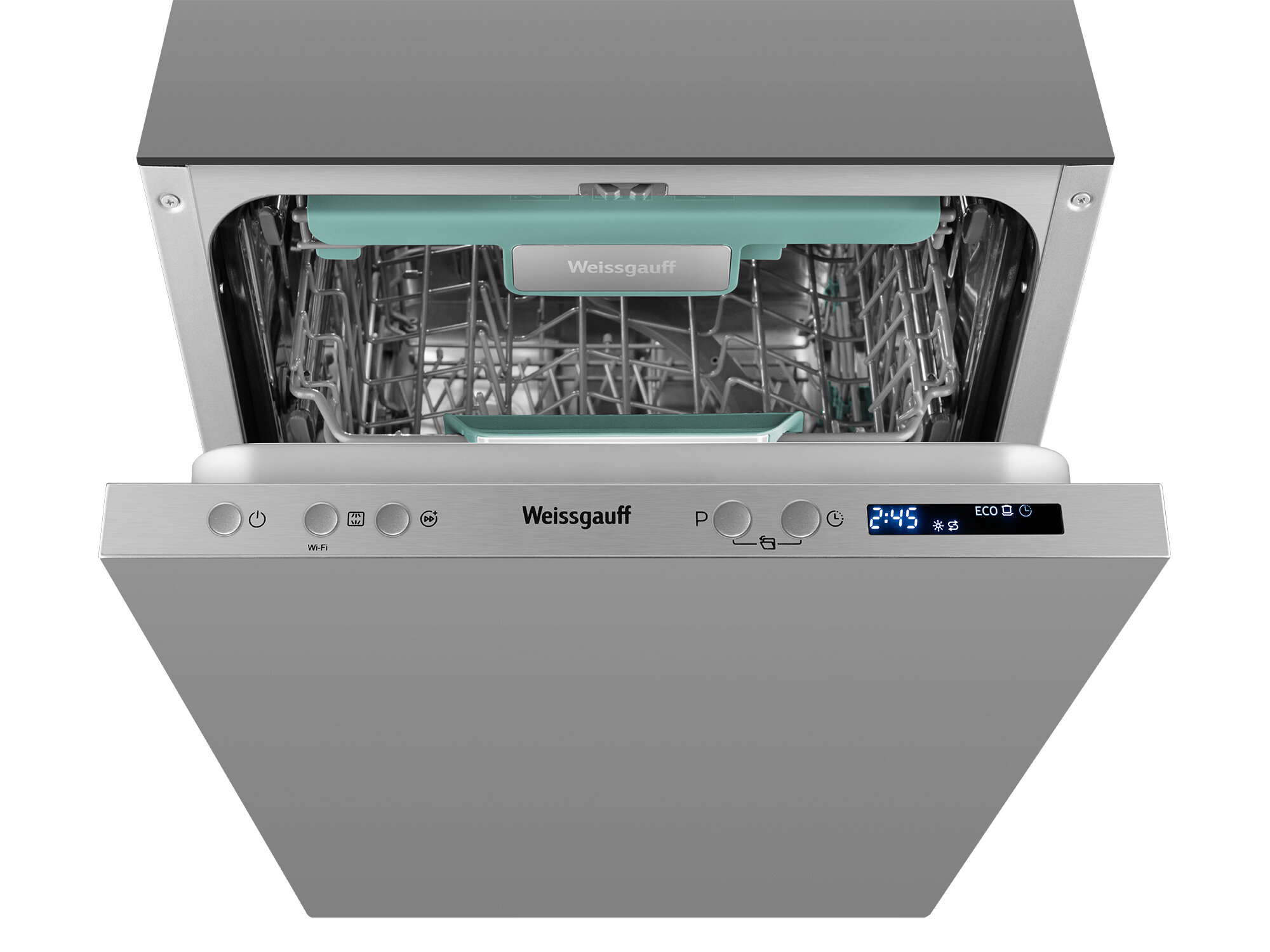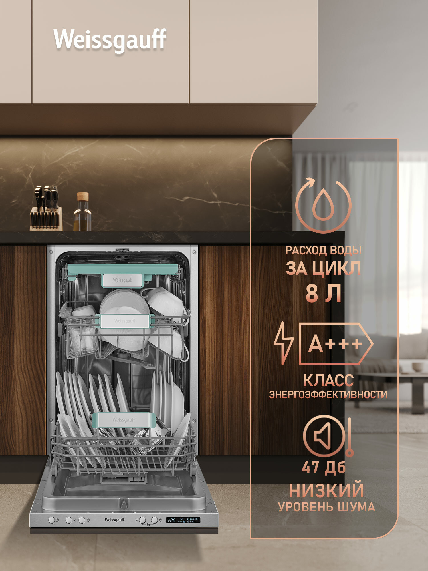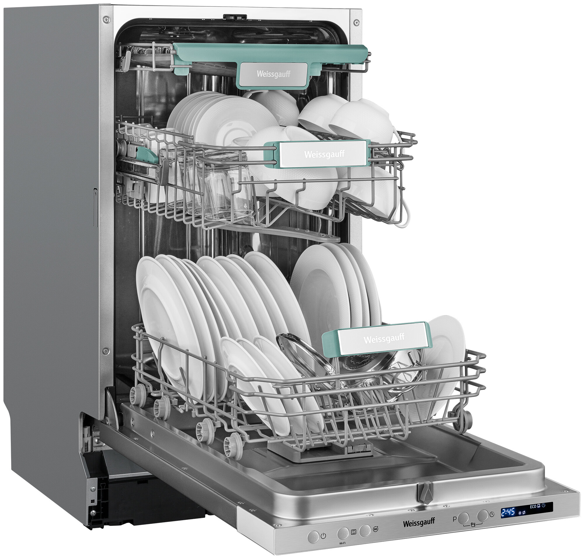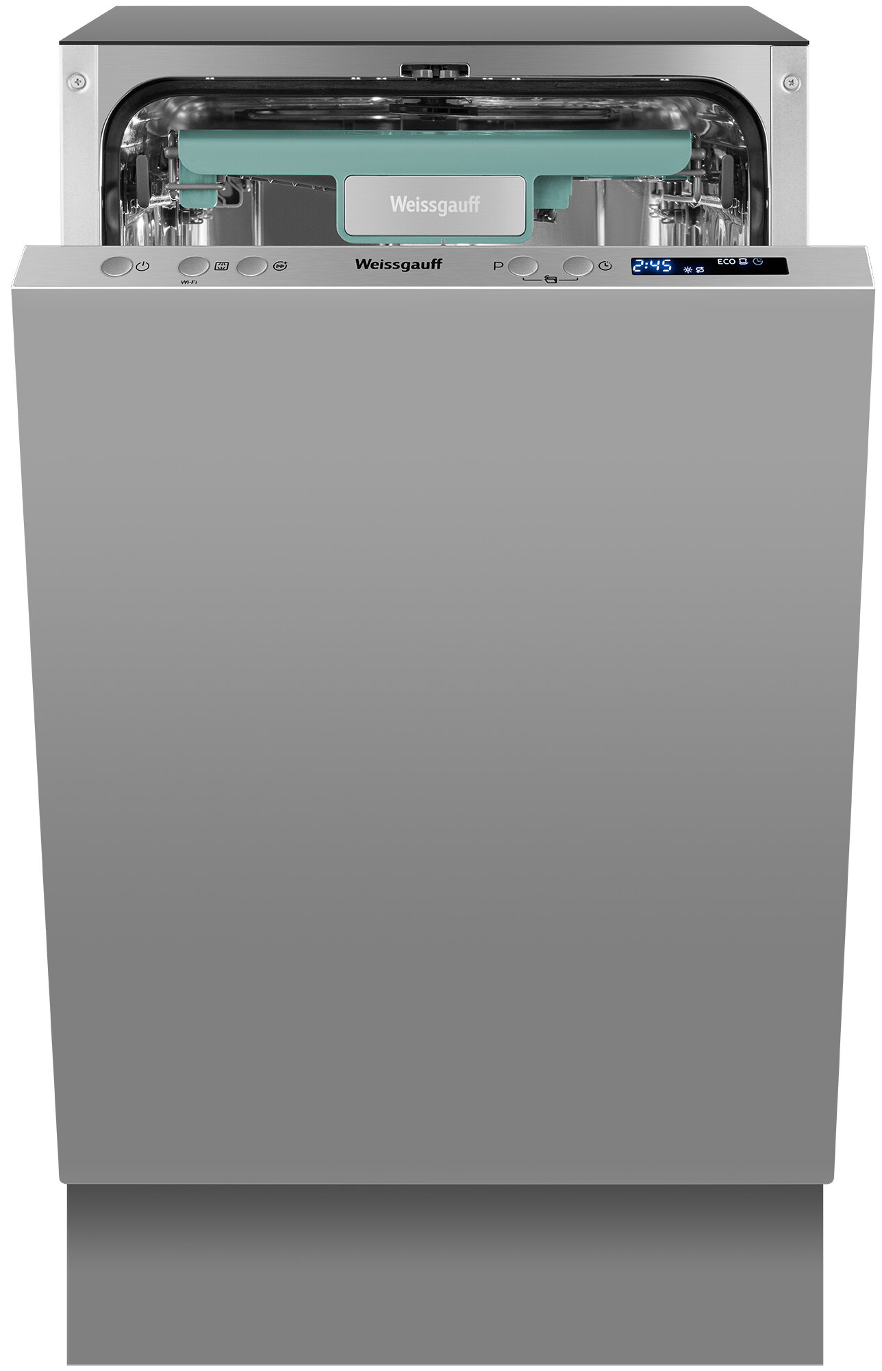 Узкор корпус шириной 44.8 см специально разработан для малогабаритных кухонь. При глубине установки 55 см машина Weissgauff BDW 4533 D Wi-Fi помещается в стандартные ниши для встраиваемой техники. Тесты показали: аппарат на 15% компактнее аналогов, что подтверждают отзывы владельцев студий.