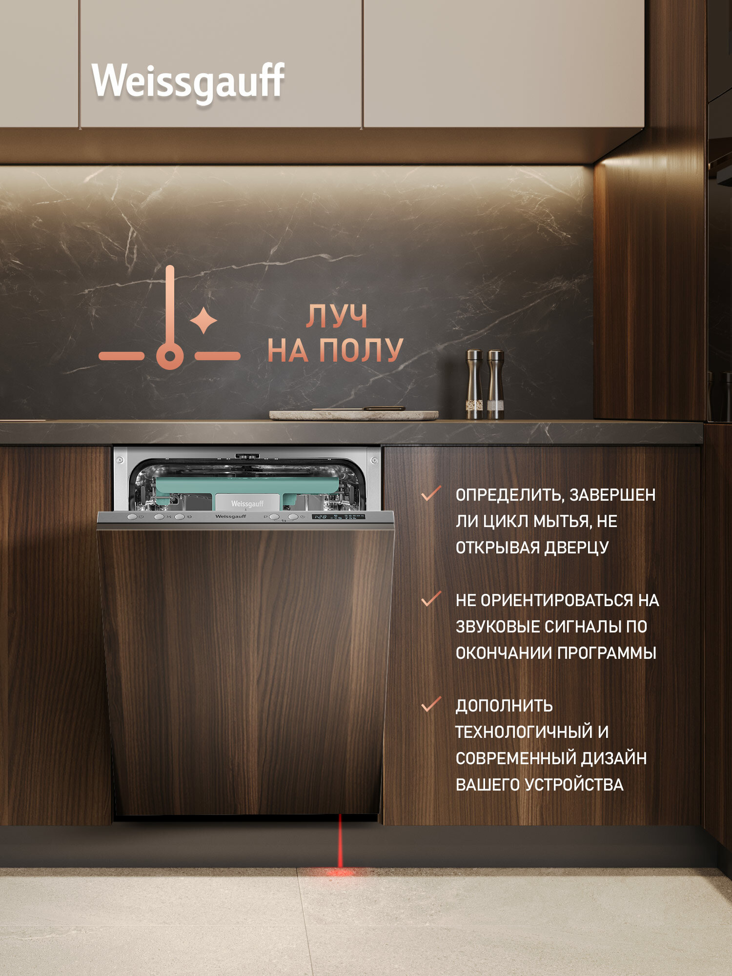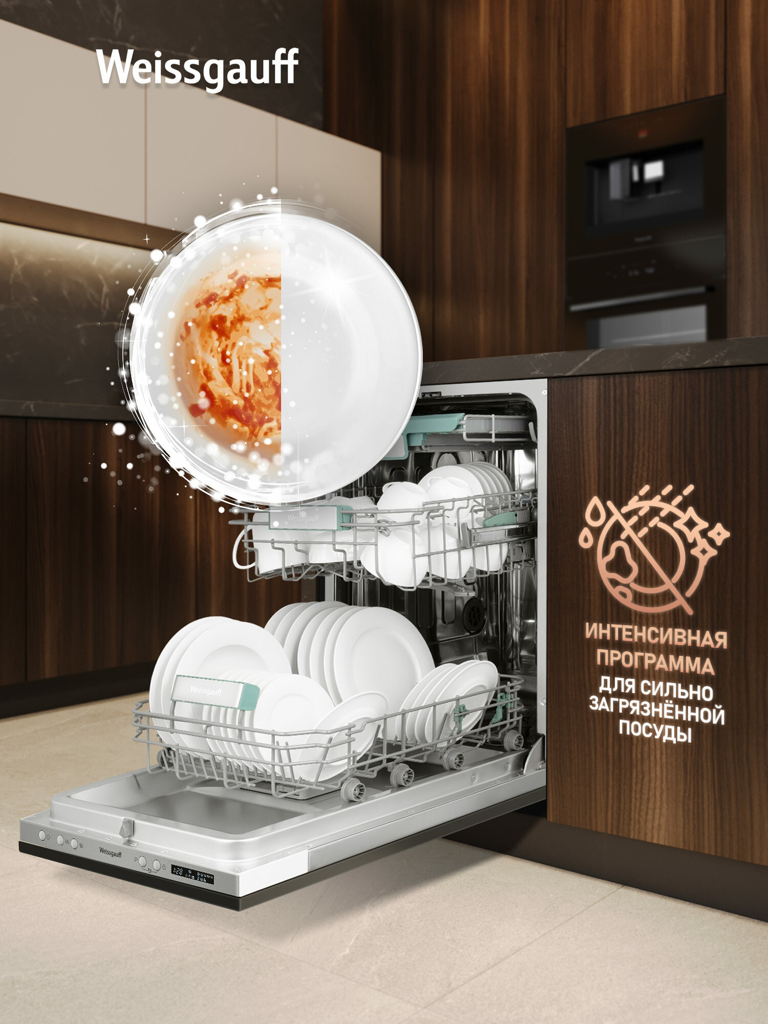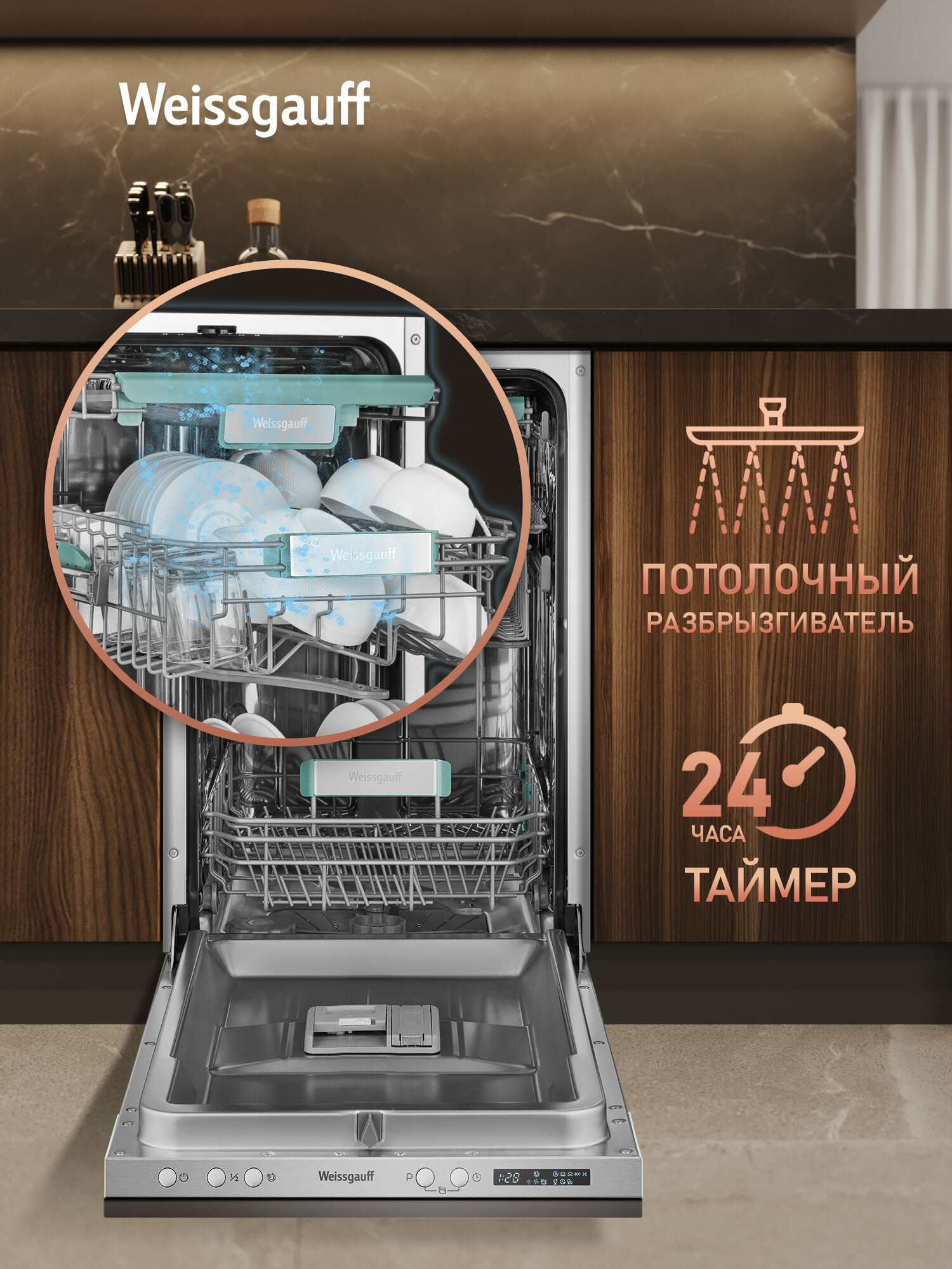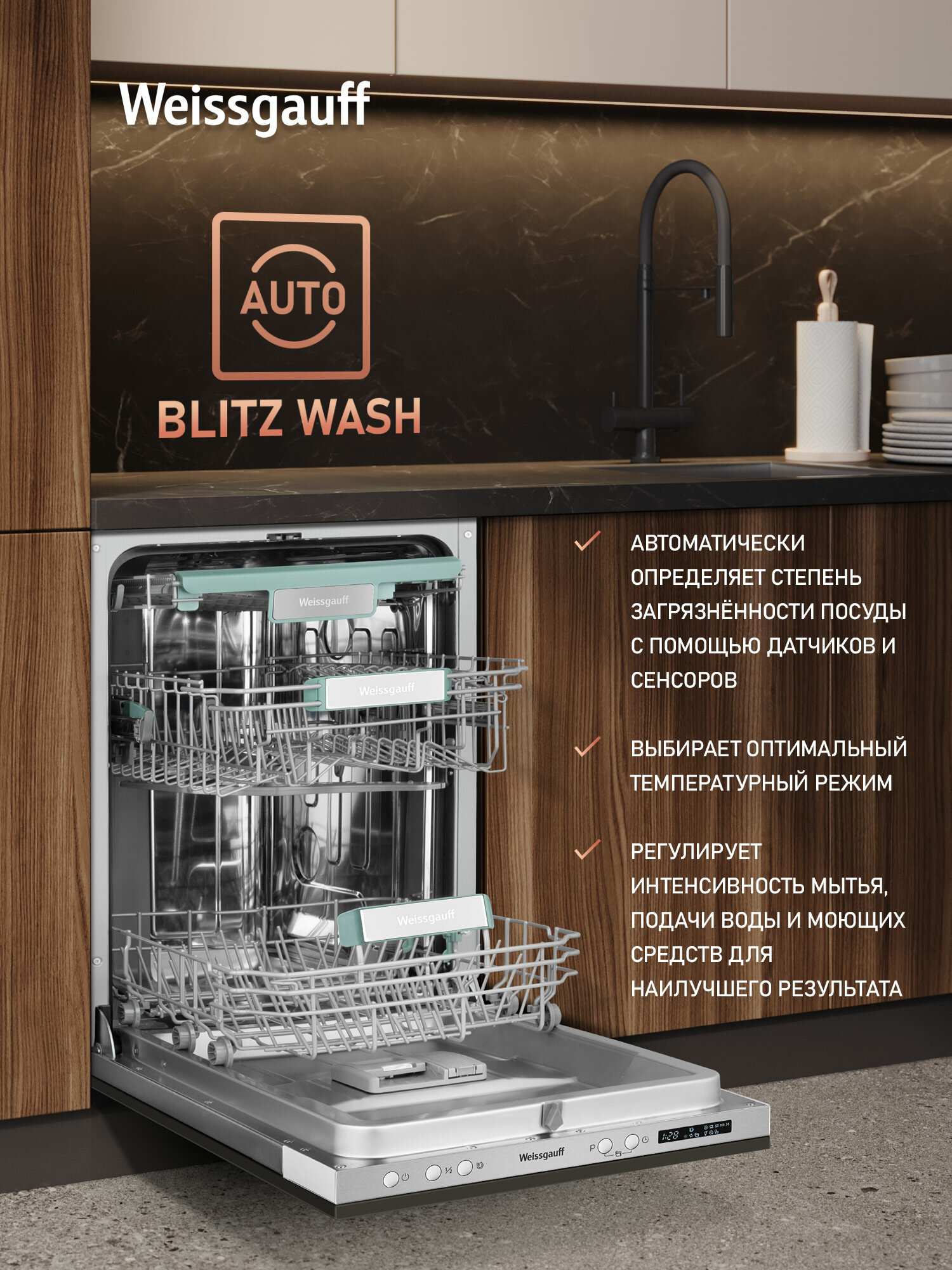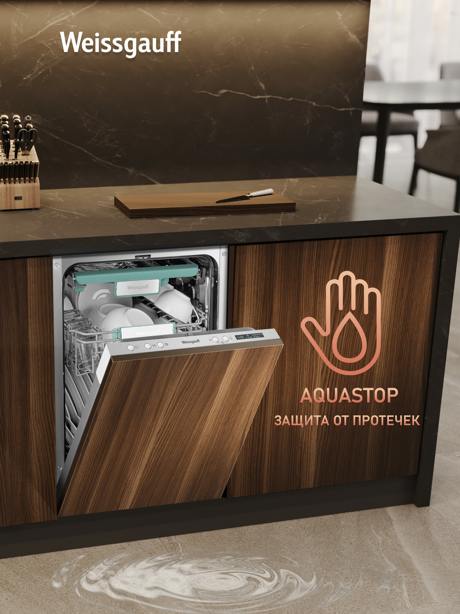 Узкор корпус шириной 44.8 см специально разработан для малогабаритных кухонь. При глубине установки 55 см машина Weissgauff BDW 4533 D Wi-Fi помещается в стандартные ниши для встраиваемой техники. Тесты показали: аппарат на 15% компактнее аналогов, что подтверждают отзывы владельцев студий.