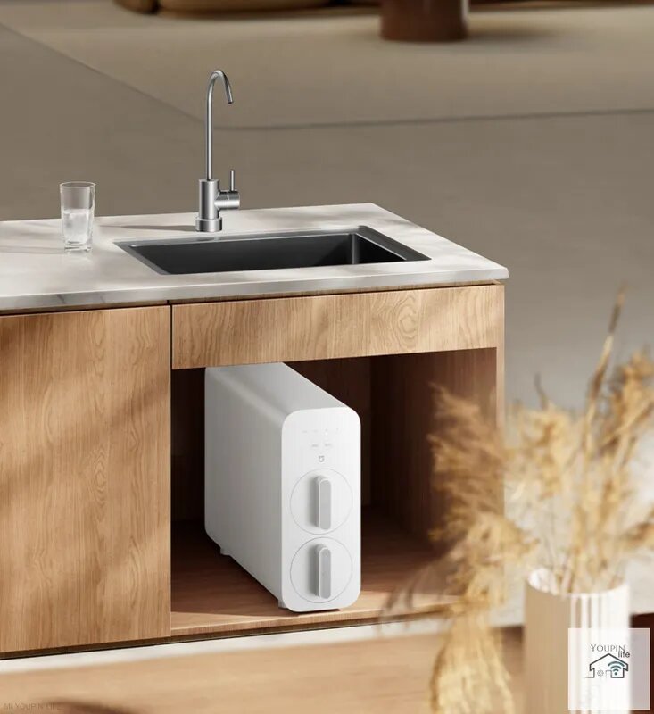 Компактный белый корпус толщиной 14.7 см позволяет установить систему даже в небольшие тумбы под мойкой. Инженеры Xiaomi разработали специальную систему креплений, исключающую вибрации при работе помпы.