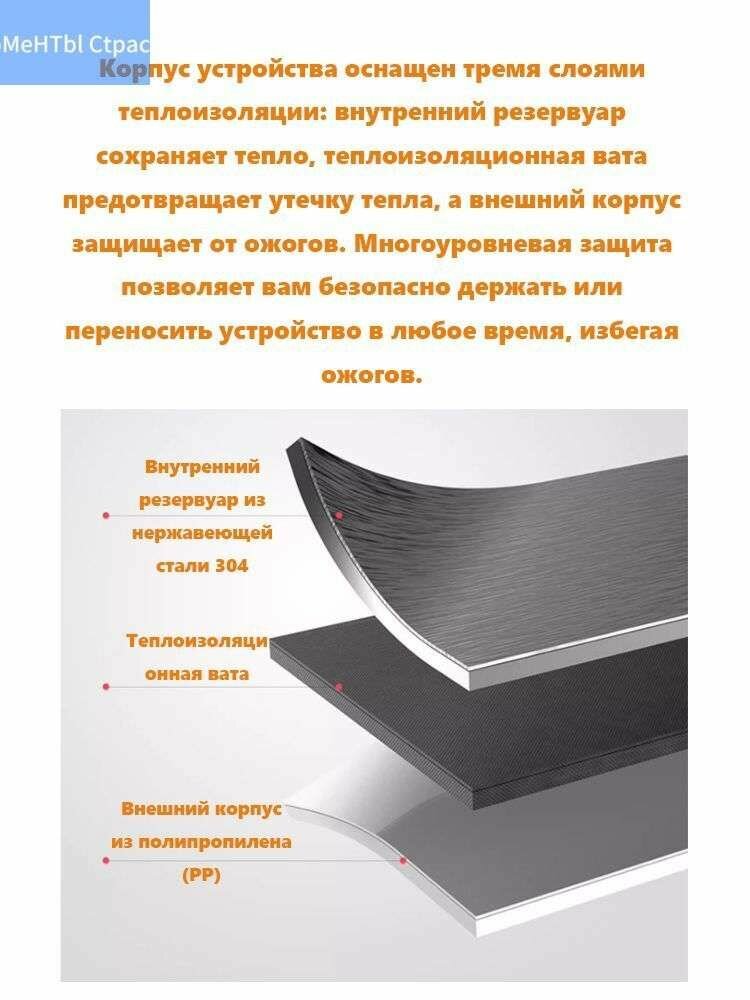 - Комбинированный корпус из нержавеющей стали (внутренний слой) и термостойкого пластика снижает вес до 480 г. В отличие от цельнометаллических thermos-чашек, поверхность не нагревается выше 45°C при контакте.