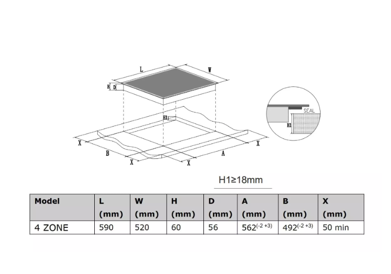 - Габаритные размеры 59х52 см позволяют устанавливать панель как в новые кухни, так и при замене старой техники без переделки столешницы
