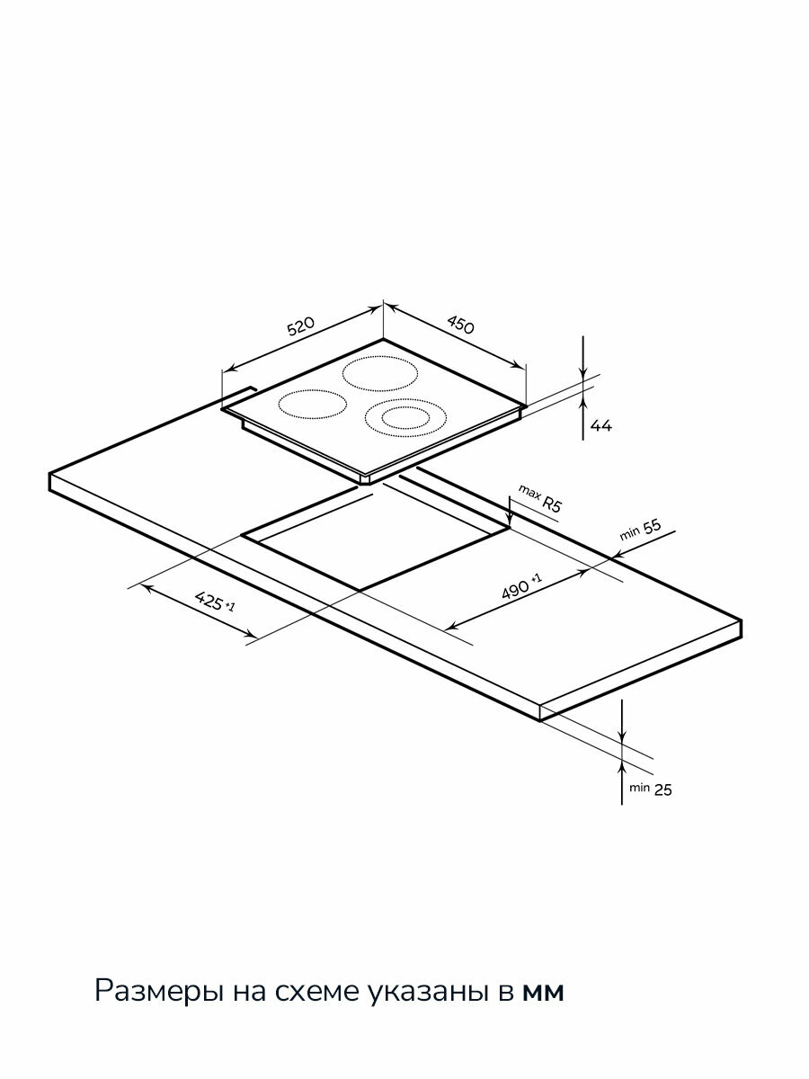 Для установки в стандартную столешницу требуется вырез 43×50 см (±2 мм). Глубина рабочей зоны составляет 5.2 см — достаточно для синхронизации с большинством духовых шкафов. В комплекте алюминиевая рамка скрывает сколы материала после монтажа.