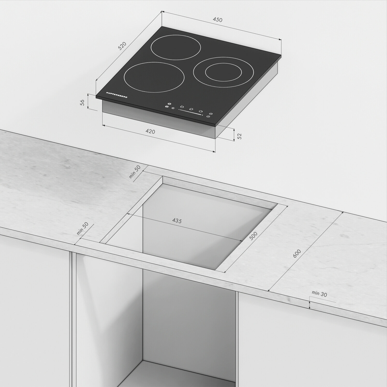 Автономная установка Kuppersberg ECS 402 2025 года позволяет интеграцию в столешницы толщиной 10-40 мм. Требования к вырезу составляют 45×52 см — это на 15% меньше стандартов для аналогичных индукционных панелей: