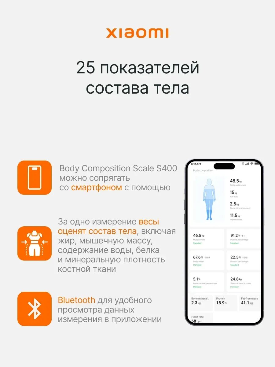 Body Composition Scale S400 использует 4 высокочувствительных сенсора для измерения 10 показателей: