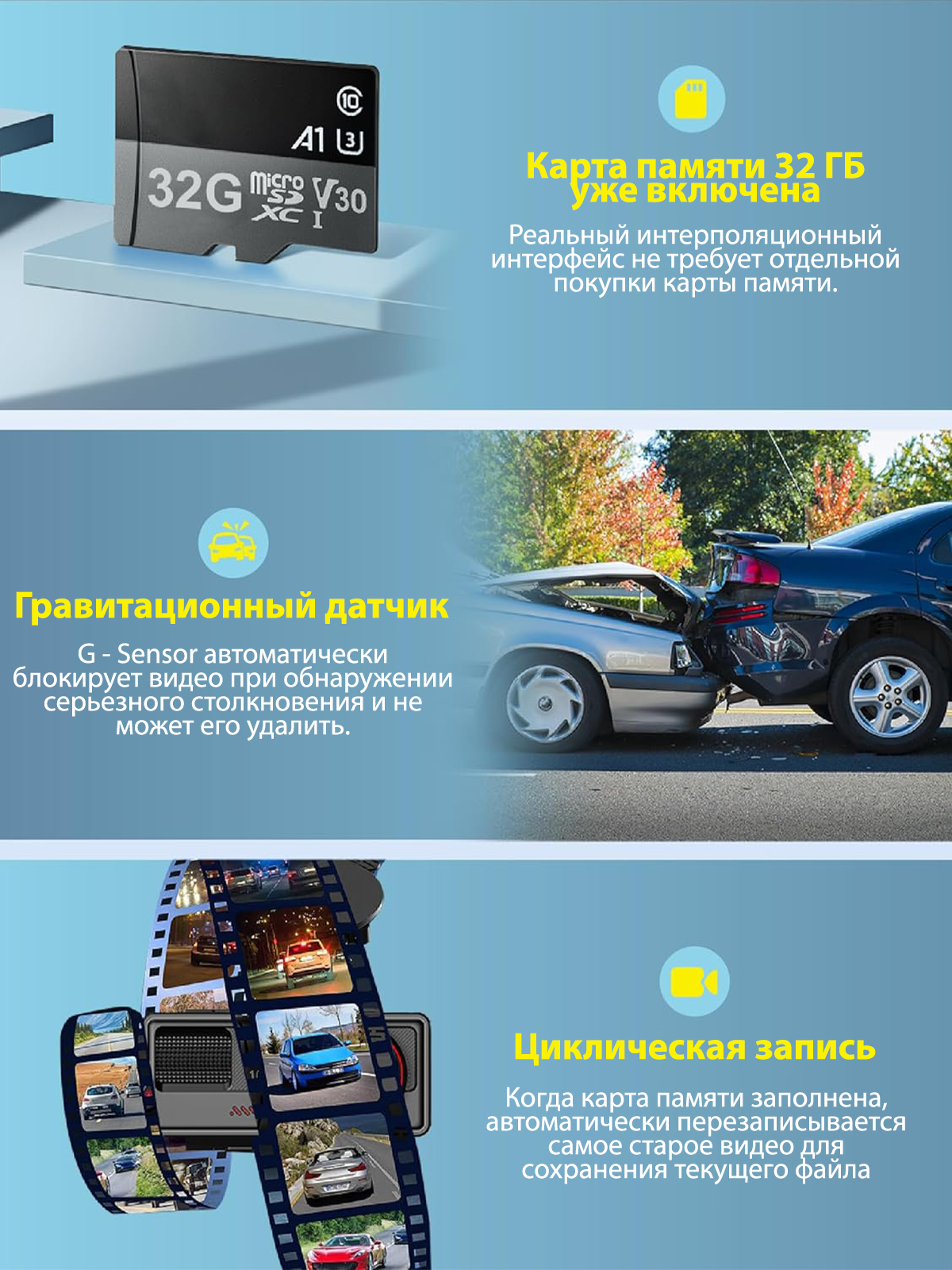 | Удар при ДТП (>1.2G) | Сохранение 30-секундного ролика до и после события |