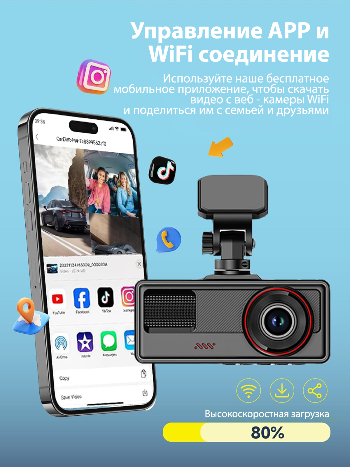 Протокол передачи данных IEEE 802.11ac обеспечивает скорость синхронизации 120 Мбит/с - перенос 5-минутного видео занимает 22 секунды. Приложение DashCam Pro доступно для: