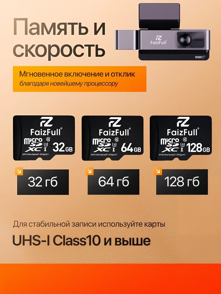 Энергопотребление 4.5 Вт позволяет непрерывно записывать видео до 12 часов при отключенном двигателе (с дополнительным аккумулятором 5000 мАч). Устройство поддерживает SD-карты классов U3 и V30 с гарантированной скоростью записи 50 МБ/с — важный параметр для