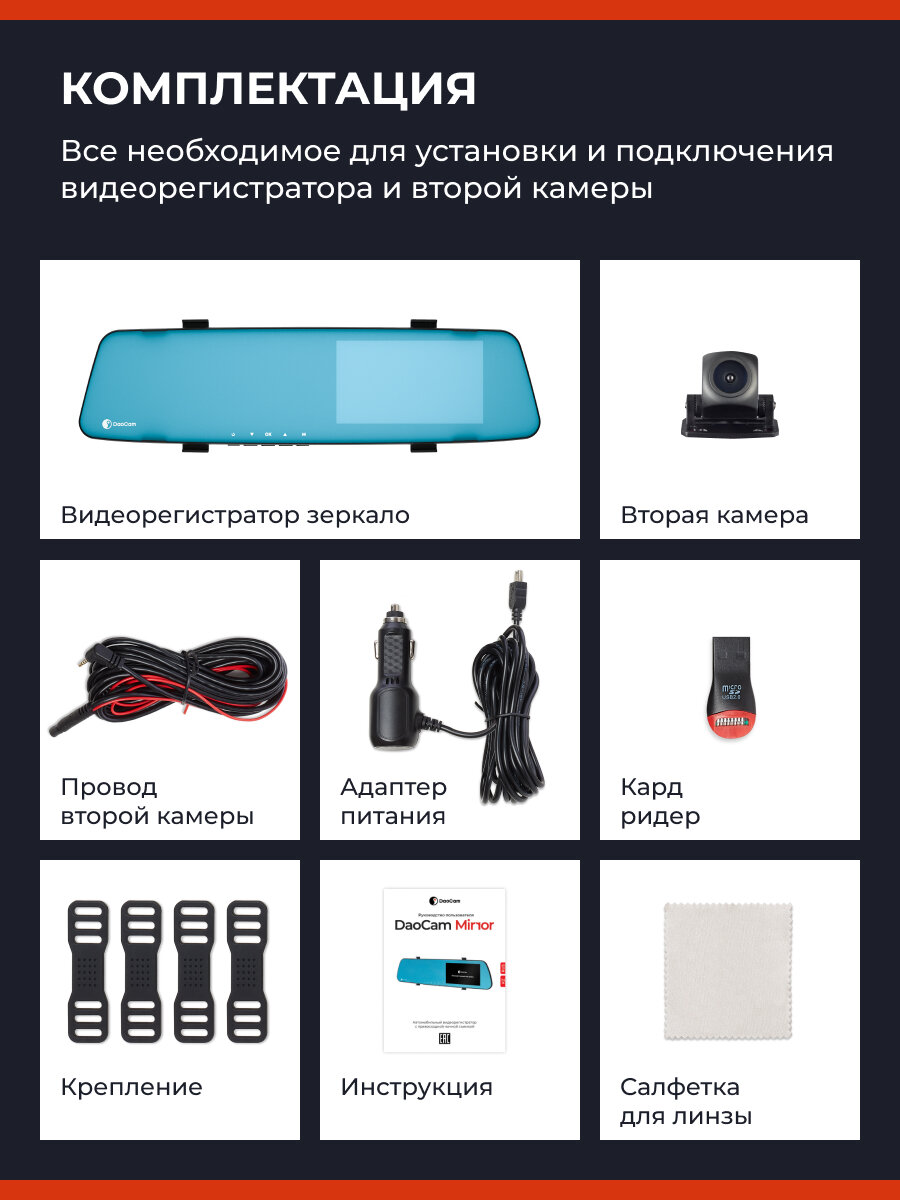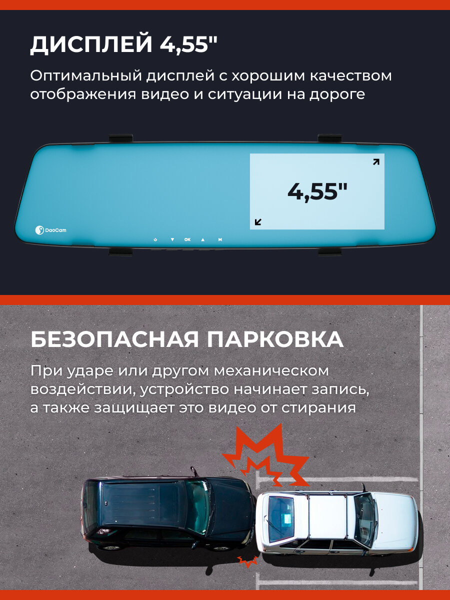 Зеркало видеорегистратор DaoCam Mirror Wi-Fi заменяет штатное автозеркало без сверления отверстий. Система креплений подходит для 98% моделей автомобилей — от компактных хэтчбеков до внедорожников. Основные технические параметры:
