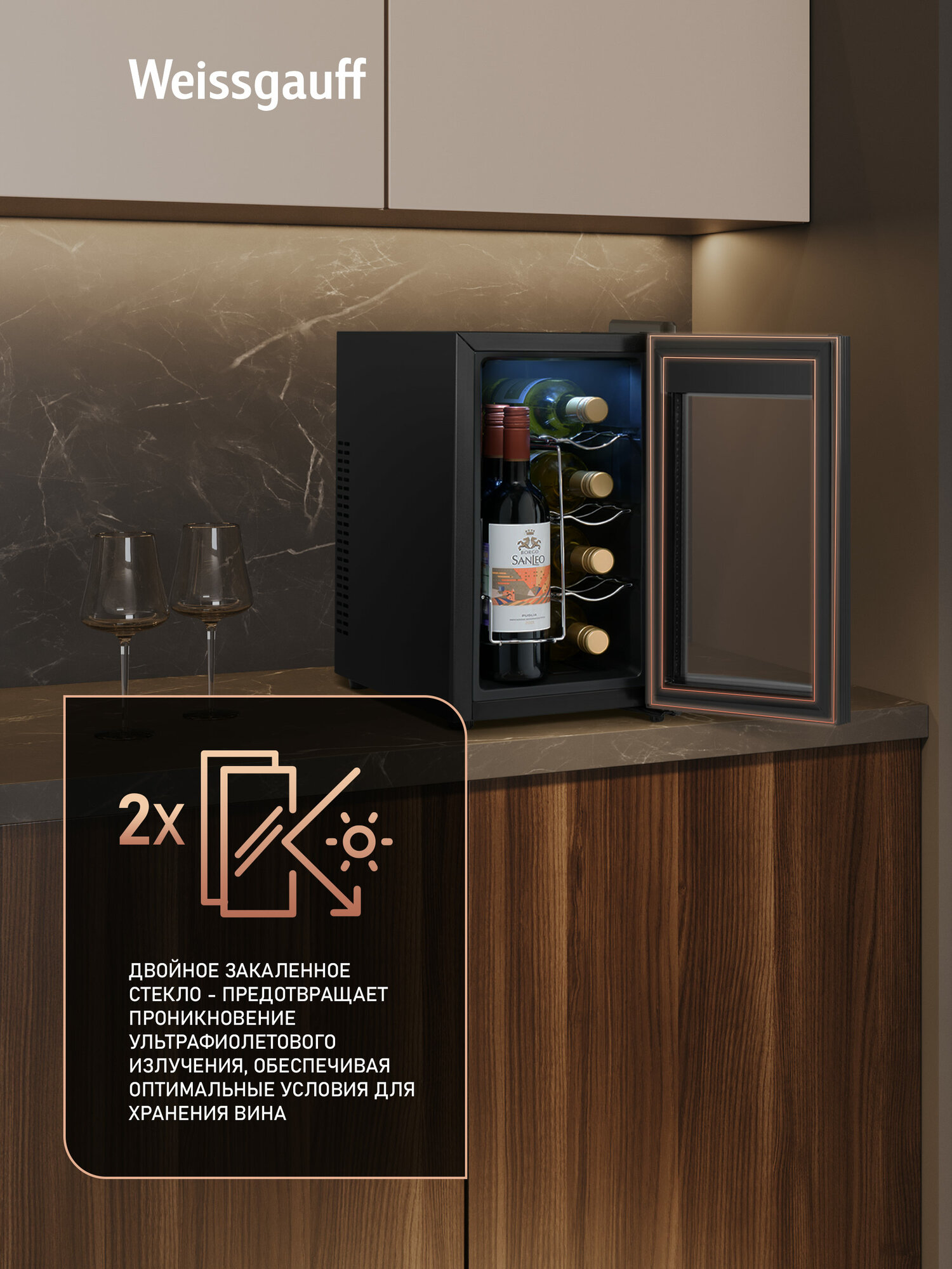 Чёрное закалённое стекло дверцы с защитой от УФ-лучей предотвращает выгорание этикеток. Встроенная LED-подсветка активируется при открытии, потребляя всего 2.1 Вт электроэнергии.