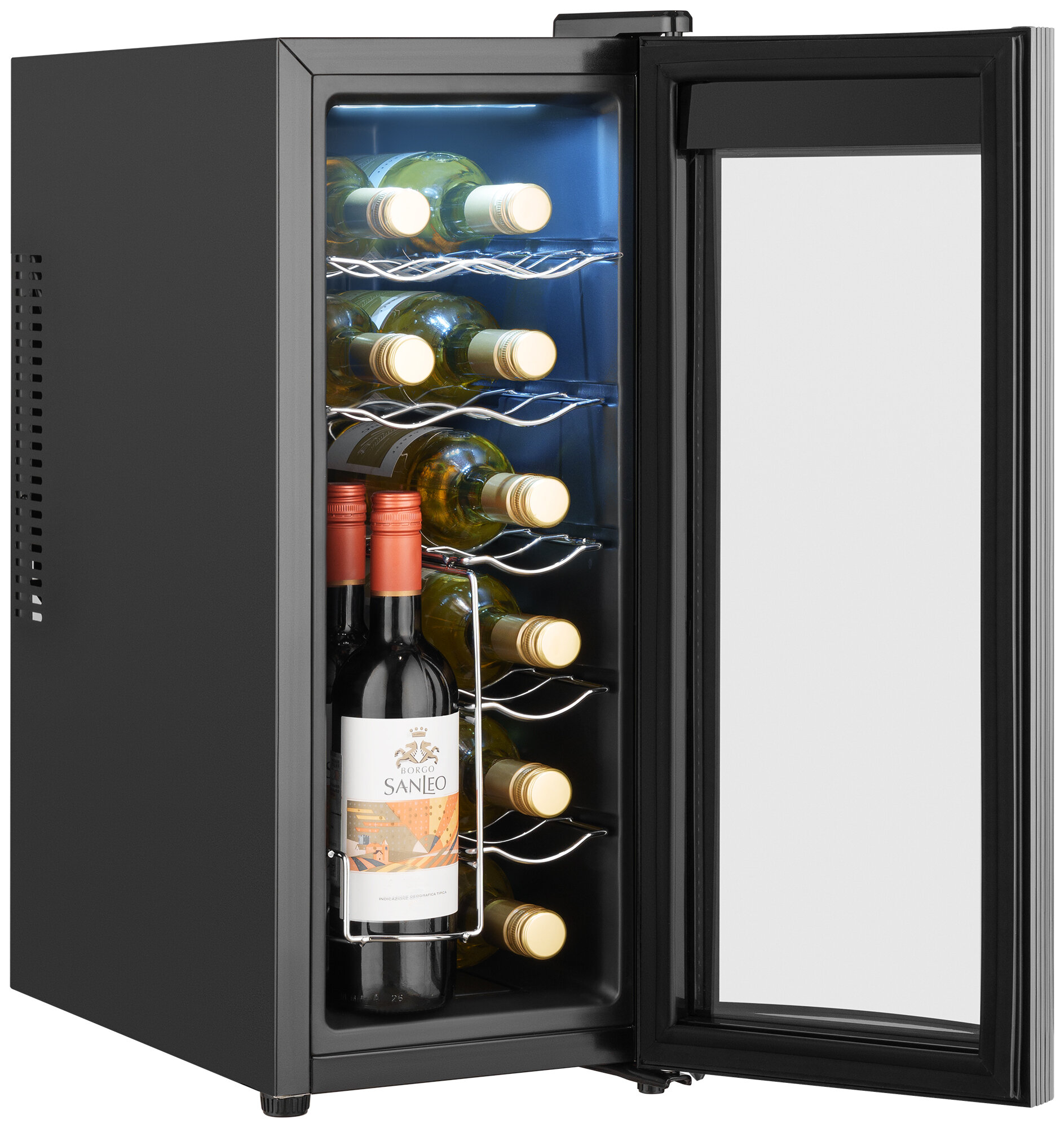 5 деревянных полок обеспечивают хранение 12 стандартных винных бутылок ёмкостью 0,75 л каждая. Направляющие с защитой от выпадения гарантируют безопасное размещение коллекционных экземпляров.