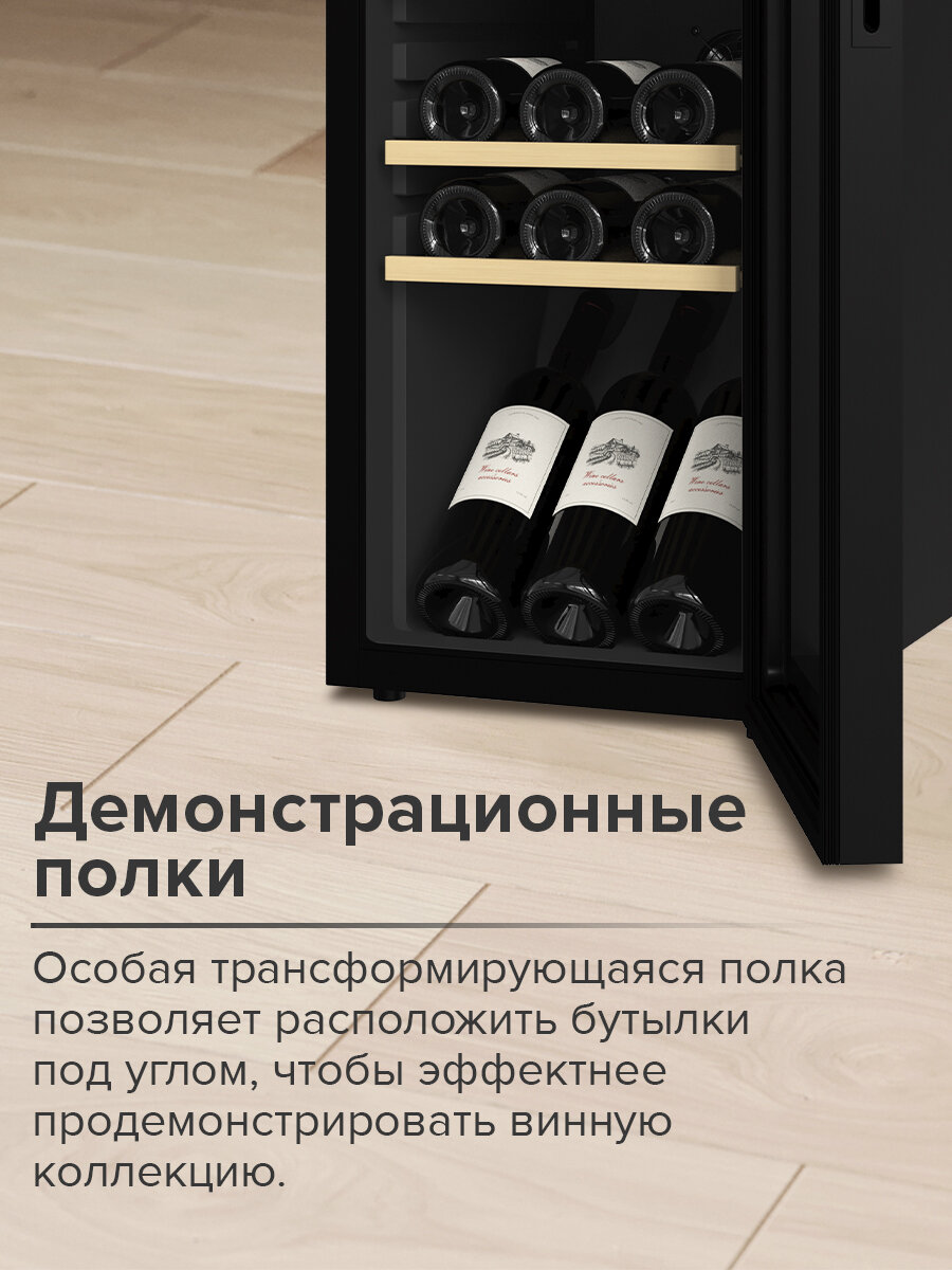 - Ёмкость для бутылок нестандартной формы — можно хранить 3 магнума или 18 стандартных бутылок 0.75 л