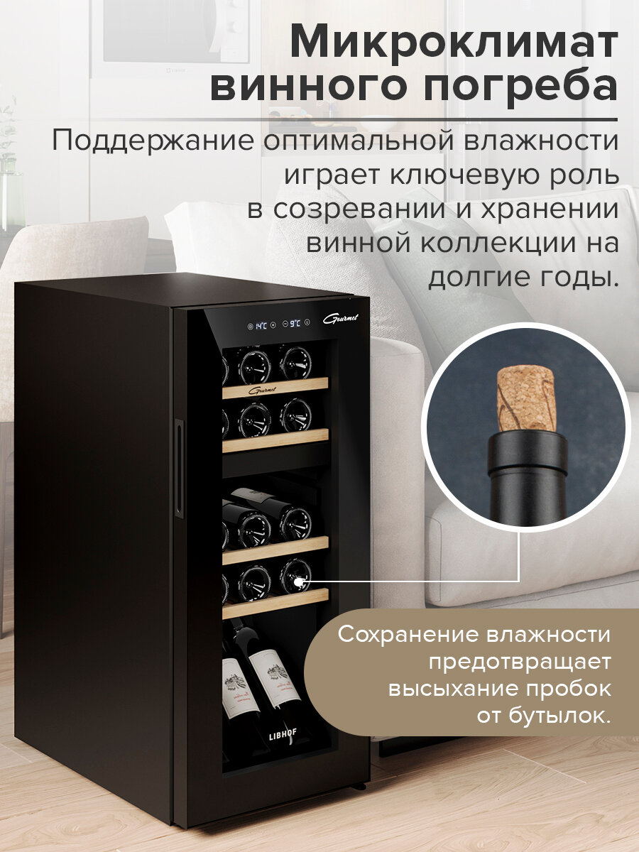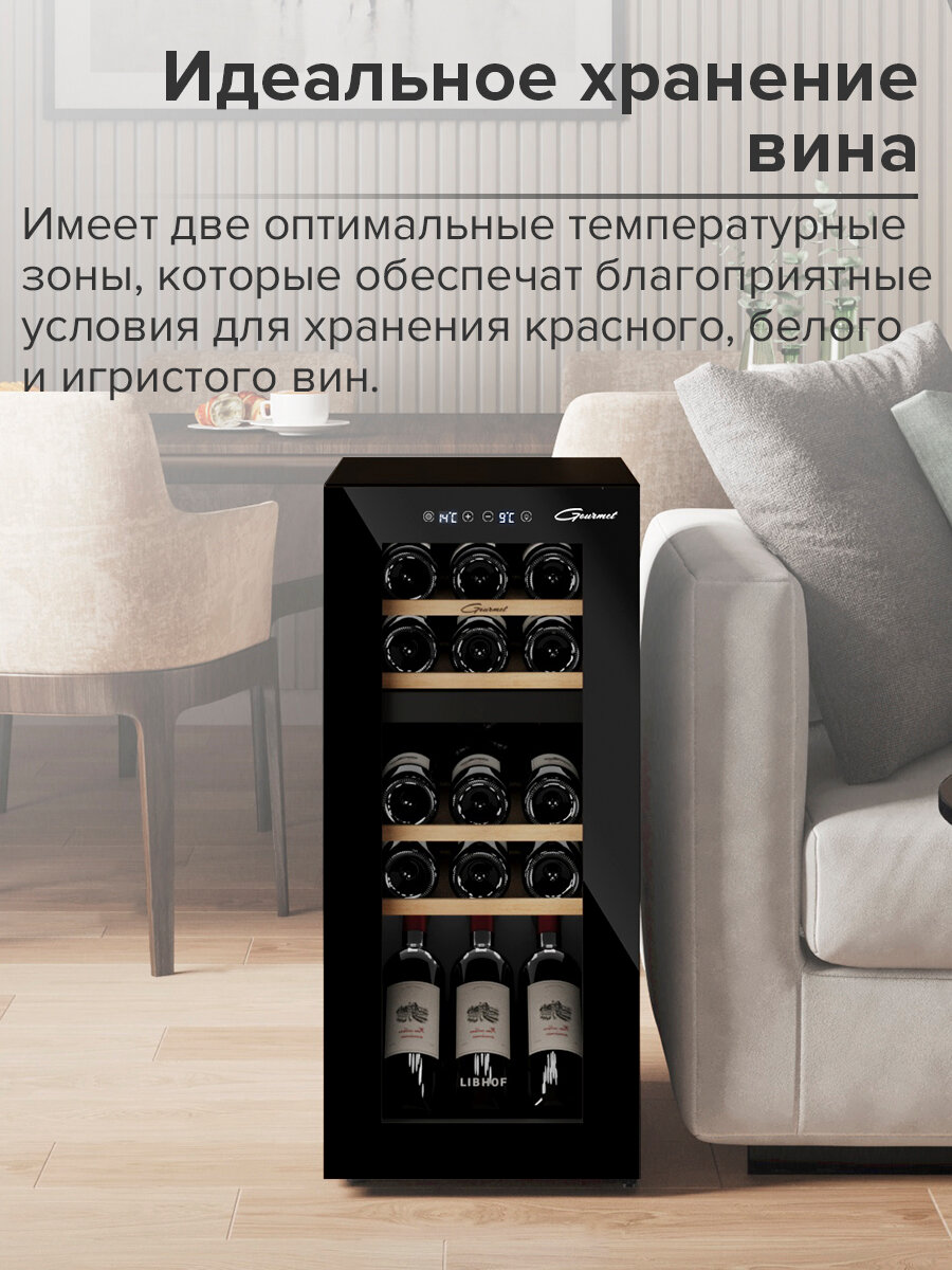 Винный шкаф Libhof GMD-15 black создан для оптимального хранения 15 стандартных бутылок емкостью 0.75 л. Габаритные размеры 34.5x45x78.2 см позволяют устанавливать технику в кухонные ниши или использовать как самостоятельный элемент интерьера. Две независимые температурные зоны поддерживают разные режимы: 5-12°C для белых вин и 12-18°C для красных сортов с точностью регулировки ±1°C.